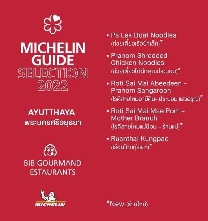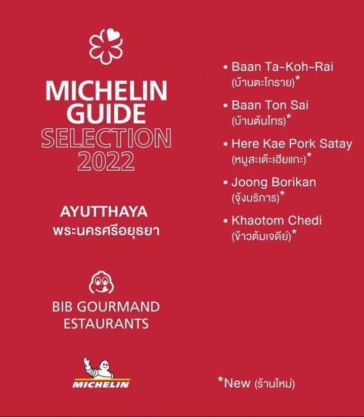 ซึ่งในส่วนของจังหวัดพระนครศรีอยุธยา ในปี 2022 ที่ผ่านมา มีร้านที่ได้ Michelin Guide รางวัลบิบ กูร์มองด์ จำนวน 10 ร้าน ซึ่งมีทั้งประเภทร้านอาหารและ Street Food สำหรับปี 2023 นี้ มีร้านที่ได้ Michelin Guide รางวัลบิบ กูร์มองด์ เพิ่มอีก จำนวน 3 ร้าน ประกอบไปด้วย 1.ร้านกินลูกเดียว 2.โอโภชนา และ 3.ก๋วยเตี๋ยวเรือไก่ฉีกป้าปุ๊