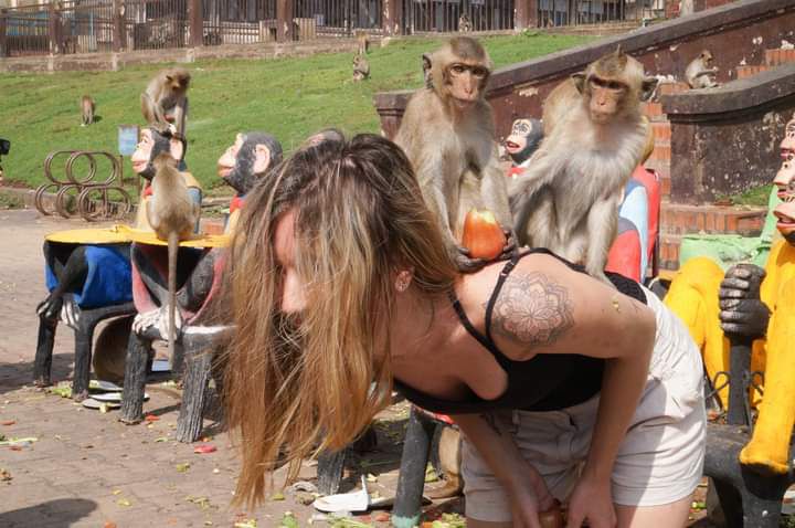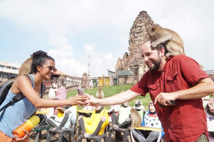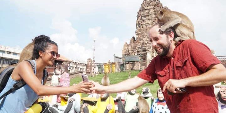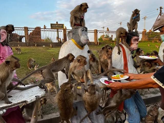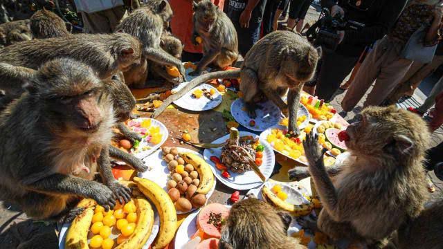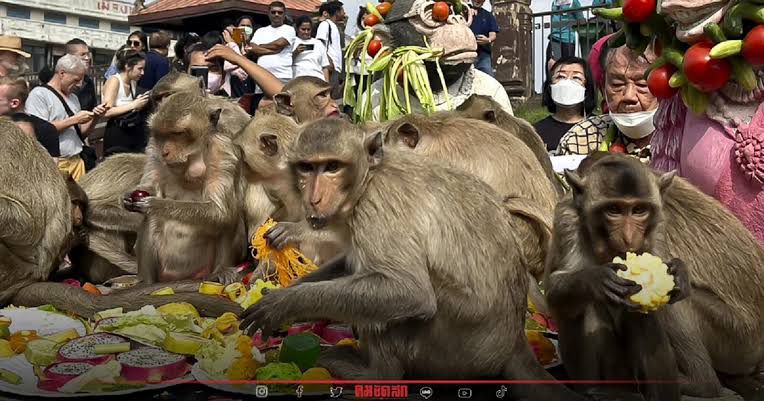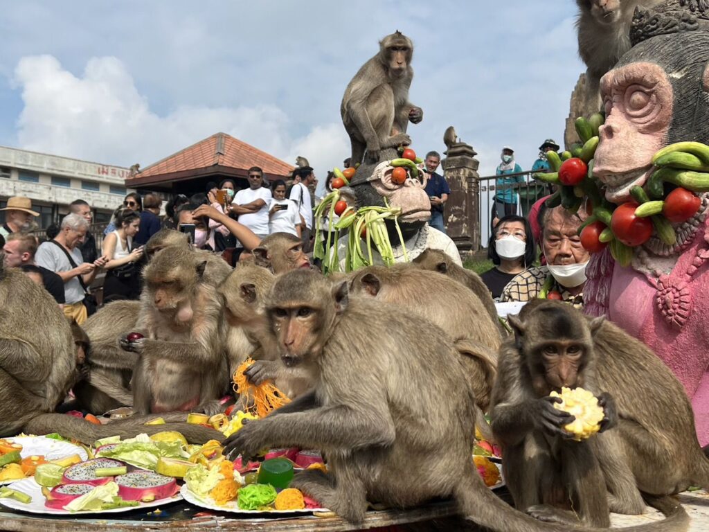 นักท่องเที่ยวต่างชาติ ร่วมงานเลี้ยง”โต๊ะจีนลิง” จ.ลพบุรี ครั้งที่ 34 ภายใต้แนวความคิด “ลิงเลี้ยงลิง” ทำให้ลิงลงมากินอาหารจำนวนมากขึ้น