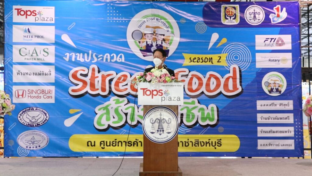 วันที่ 28 พฤศจิกายน 2565 เวลา 10.00 น.นายวิจิตร เลิศไพบูลย์ ประธานสภาอุตสาหกรรมจังหวัดสิงห์บุรี เป็นประธานเปิดโครงการ” Street Food “สร้างอาชีพ(Season 2)ให้กับผู้ถูกคุมความประพฤติที่อยู่ระหว่างการดูแลของสำนักงานคุมประพฤติจังหวัดสิงห์บุรี ประจำปี 2565 ณ ศูนย์การค้าท๊อปส์พลาซ่า สิงห์บุรี โดยมี นายภูริวัชญ์ ลิขิตสกุลเดช ประธานชมรมอาสาสมัครคุมประพฤติจังหวัดสิงห์บุรี ว่าที่ร้องตรีจำนงค์ แก้วมาดีงาม ผู้อำนวยการสำนักงานคุมประพฤติจังหวัดสิงห์บุรี รองนายแพทย์สาธารณสุขจังหวัดสิงห์บุรี เจ้าหน้าที่คุมประพฤติเและอาสาสมัครคุมประพฤติจังหวัดสิงห์บุรี เข้าร่วมโครงการฯมีวัตถุประสงค์เพื่อนำเสนอผลงานด้านการทำอาหารของผู้ที่อยู่ในความดูแลของสำนักงานคุมประพฤติจังหวัดสิงห์บุรีและการแสดงพฤติกรรมถึงพลังและความร่วมมือของชมรมอาสาสมัครคุมประพฤติจังหวัดสิงห์บุรี ภาคีเครือข่ายในการคืนคนดีสู่สังคม