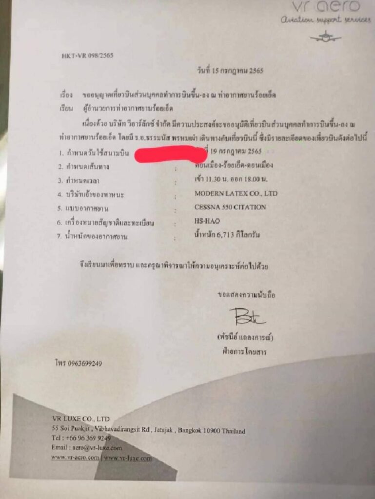เครื่องบินเป็นของ บริษัท โมเดิร์นลาเท็กซ์ จำกัด ส่วนเครื่องหมายสัญชาติและทะเบียน คือ HS-HAO