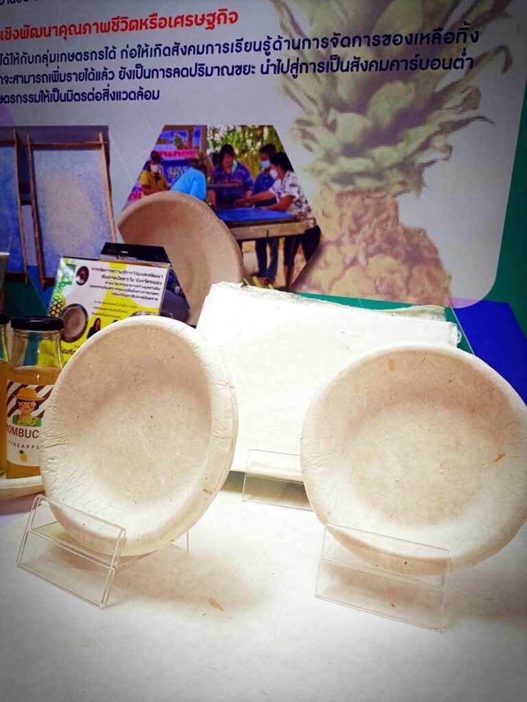 สำหรับวัสดุเหลือทิ้งทางการเกษตร ได้แก่ เปลือกมะพร้าว ชานอ้อย ฟางข้าว ทางทีมวิจัยได้มีการนำองค์ความรู้ทางเทคโนโลยี มาพัฒนาประยุกต์ผลิตกระดาษจากใยสับปะรด ซึ่งพบว่ากระดาษสับปะรดมีคุณสมบัติพิเศษคือมีความนุ่มเหนียว และทำได้บางกว่ากระดาษจากใยพืชชนิดอื่นๆ สามารถนำไปประยุกต์ใช้กับงานคราฟต์ และงานหัตถกรรมได้ดี และเมื่อนำไปอัดด้วยความร้อนจะได้เป็นภาชนะและบรรจุภัณฑ์ที่ย่อยสลายได้ เป็นมิตรต่อสิ่งแวดล้อม