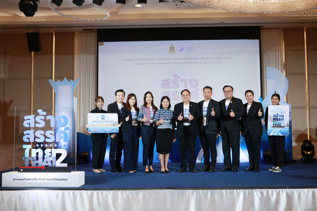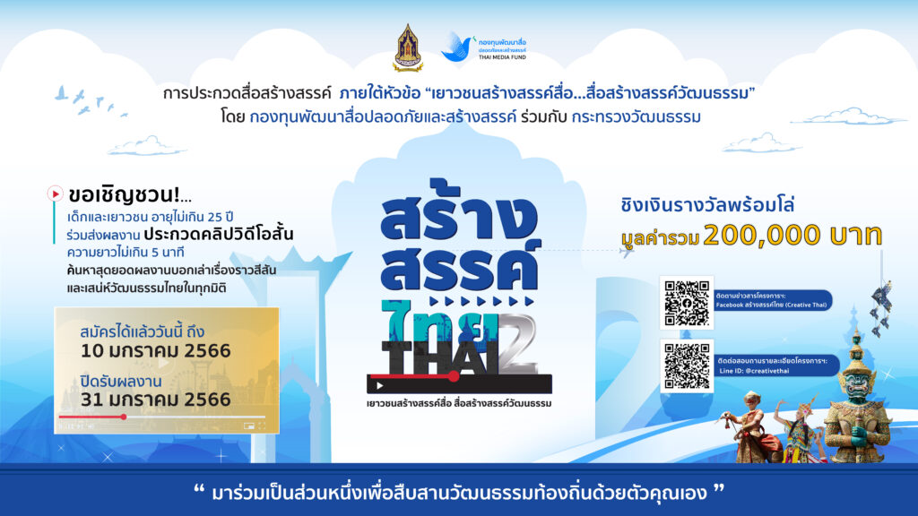 กองทุนพัฒนาสื่อปลอดภัยและสร้างสรรค์ จัดโครงการ สร้างสรรค์ไทย 2 ในหัวข้อ “เยาวชนสร้างสรรค์สื่อ สื่อสร้างสรรค์วัฒนธรรม” เพื่อให้เยาวชนในฐานะขุมปัญญาและการสร้างสื่อทางวัฒนธรรมท้องถิ่น มีส่วนร่วมค่านิยมและจิตสำนึกให้คนในสังคมเห็นคุณค่าภูมิปัญญาทางวัฒนธรรมหรือมรดกทางวัฒนธรรมที่จับต้องได้ ชิงเงินรางวัล 2 แสนบาท