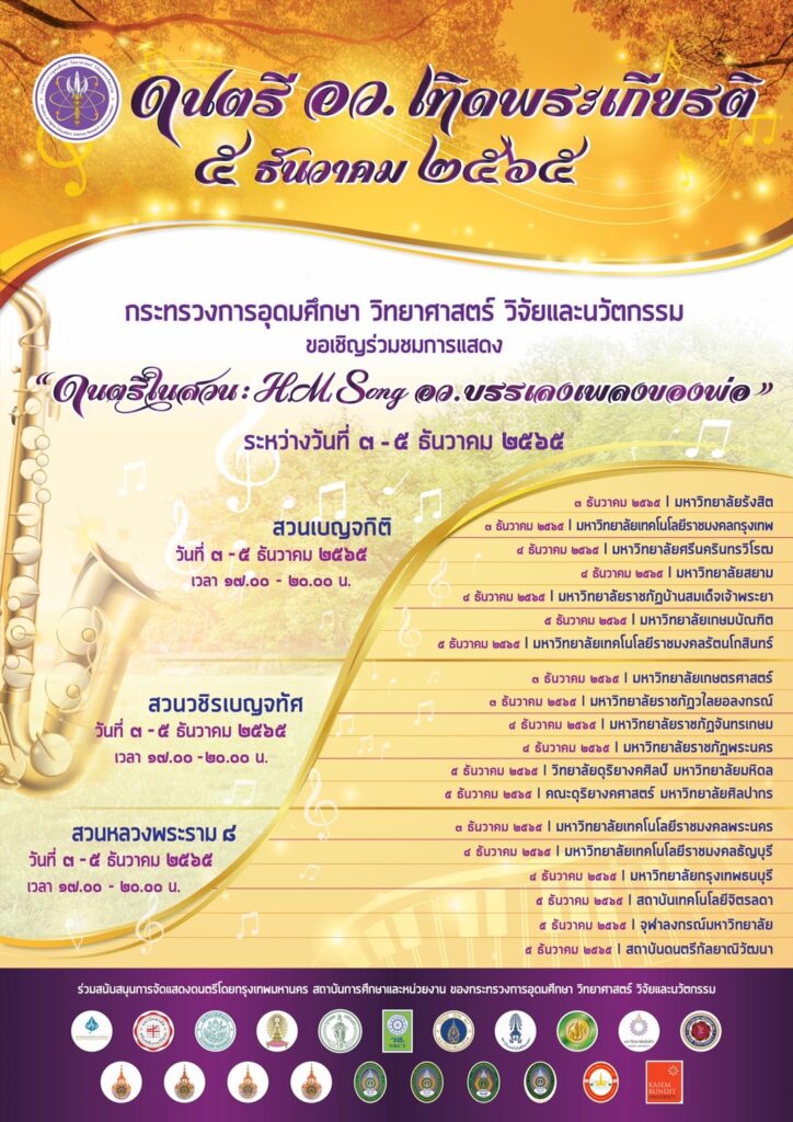กระทรวง (อว.) โดยสำนักงานการวิจัยแห่งชาติ (วช.) และหน่วยงานในสังกัดทั้งสถาบันอุดมศึกษา และหน่วยงานด้านวิทยาศาสตร์ วิจัยและนวัตกรรม จึงร่วมกันจัดกิจกรรมเทิดพระเกียรติ ร.9 เนื่องในวันคล้ายวันพระราชสมภพพระบาทสมเด็จพระบรมชนกาธิเบศร มหาภูมิพลอดุลยเดชมหาราช บรมนาถบพิตร วันชาติและวันพ่อแห่งชาติ ประจำปี พ.ศ.2565 “ดนตรี อว. เทิดพระเกียรติ 5 ธันวาคม 2565” ขึ้นเป็นปีที่ 2 ซึ่ง “ดนตรี” ถือเป็นอีกหนึ่งศิลป์ที่กระทรวง (อว.) ให้ความสำคัญ นอกเหนือจากศาสตร์ที่เป็นการสร้างองค์ความรู้ การวิจัยและพัฒนาด้านวิทยาศาสตร์ เทคโนโลยีและนวัตกรรม