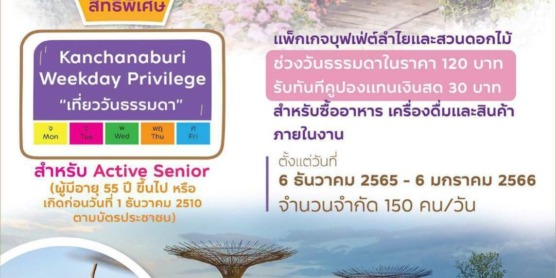 ททท.กาญจนบุรี ร่วมกับ สวนเมเปิ้ล ชวนเที่ยวงานบุฟเฟ่ต์ลำไยและสวนดอกไม้ ครั้งที่ 6 พร้อมมอบสิทธิพิเศษสำหรับนักท่องเที่ยวกลุ่ม Active Senior อายุตั้งแต่ 55 ปีขึ้นไป ที่เข้าชมงานในวันธรรมดา (ระหว่างวันจันทร์-ศุกร์ : ยกเว้นวันหยุดนักขัตฤกษ์ และวันหยุดชดเชย) ซื้อบัตรเข้าชมราคาปกติ 120 บาท รับทันทีคูปองแทนเงินสดมูลค่า 30 บาท สำหรับแลกซื้ออาหาร เครื่องดื่ม และสินค้าภายในงาน