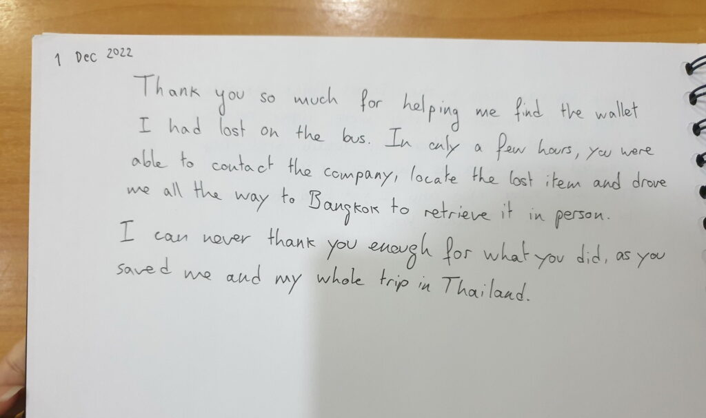 โดยนักท่องเที่ยวถึงกับประทับใจ และขอบคุณพนักงานประจำรถบัสโดยสาร และตำรวจท่องเที่ยวเป็นอย่างมาก ซึ่งสามารถติดตามกระเป๋าคืนได้อย่างรวดเร็ว และได้เขียนคำชมเชย พร้อมจะได้นำเรื่องราวไปเผยแพร่ถึงความประทับใจ เมื่อมาท่องเที่ยวที่ประเทศไทย