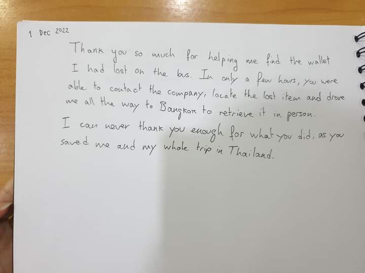 พ.ต.ท.ธนากร ธรรมเมธา สว.ส.ทท.1กก.2บก.ทท.1 จึงได้สั่งการให้เจ้าหน้าที่ตำรวจชุดสายตรวจรถยนต์ พร้อมเจ้าหน้าที่ล่ามแปลเเละนักท่องเที่ยวเดินทางไปรับกระเป๋าสตางค์ใบดังกล่าว ที่ถนนวิภาวดี ซอย17 กรุงเทพฯ ซึ่งเป็นจุดพักรถของบัสทัวร์ โดยมีนาย ธงชัย สอนคำ เป็นเจ้าของรถบัส เเละได้ทำการส่งมอบคืนให้กับนักท่องเที่ยวเป็นที่เรียบร้อย นักท่องเที่ยวตรวจสอบเเล้ว ไม่มีทรัพย์สินสิ่งใดสูญหายไป จึงได้กล่าวขอบคุณกับคนขับรถบัสเเละเจ้าหน้าที่ตำรวจท่องเที่ยวทุกคนสำหรับการช่วยเหลือเเละประทับใจในการปฎิบัติหน้าที่อย่างรวดเร็วในครั้งนี้เป็นอย่างมาก