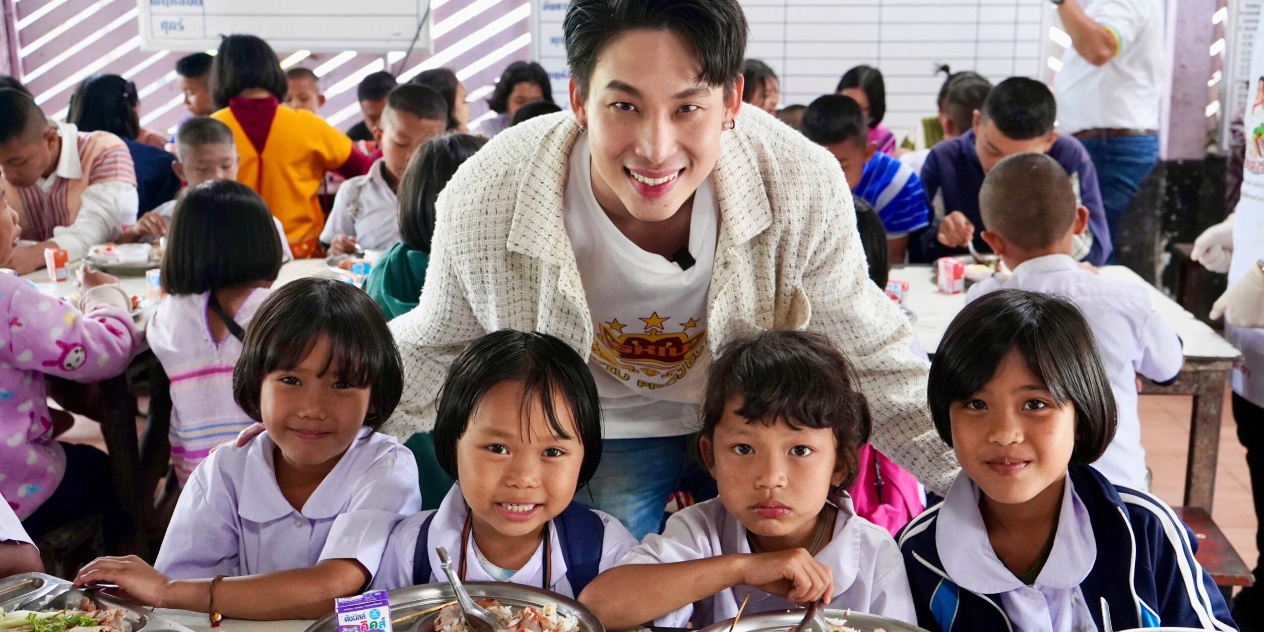 โดยบรรยากาศเต็มไปด้วยคึกคักเพราะน้องๆ และคณะครู ชาวบ้าน ณ โรงเรียน ตชด.ตะโกปิดทองจ.ราชบุรี ได้ออกมาต้อนรับ 3 หนุ่มและคณะกันอย่างตื่นเต้น โดยงานนี้ทั้ง แม็บ และ ล็อตเต้ ก็ได้เสิร์ฟอาหารทั้งของคาวของหวานให้น้องๆ กันตัวต่อโต๊ะต่อโต๊ะบอกเลยว่าทำเอาน้องๆ เขินกันยกใหญ่ เท่านั้นยังไม่พอในช่วงของกิจกรรมสองหนุ่มก็เล่นเกมเต้นเพลงไก่ย่างถูกเผาให้น้องๆ ได้เต้นตามอย่างสนุกสนาน ก่อนจะปิดท้ายด้วยเพลงเพราะๆ จากล็อตเต้ที่ตั้งใจร้องให้น้องๆ และทุกคนที่มาร่วมบริจาคสิ่งของและทำบุญด้วยกันวันนี้
