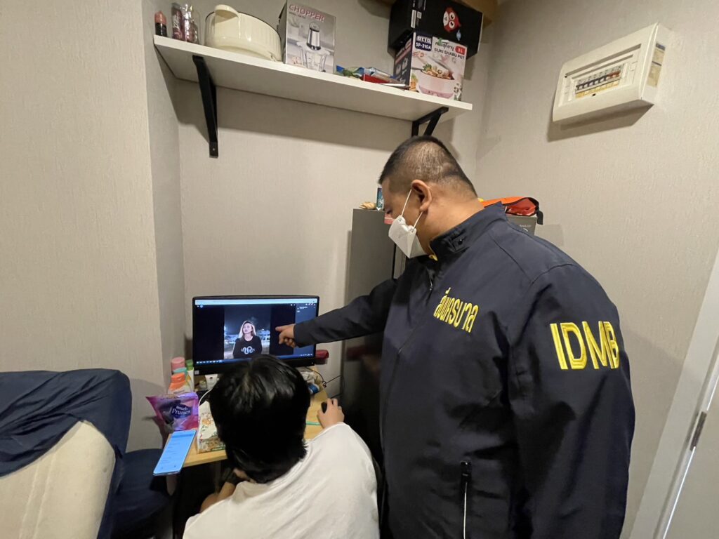 พล.ต.อ.ดำรงศักดิ์ฯ จึงได้สั่งการให้ พล.ต.ต.ธีรเดช ธรรมสุธีร์ ผบก.สส.บช.น. ในฐานะหัวหน้าชุด ศปอส.ตร. (PCT) ชุดที่ 5 ดำเนินการสืบสวนจนทราบว่าแก๊งดังกล่าวอยู่ในประเทศไทย ซึ่งตามปกติจะอยู่ฝั่งประเทศเพื่อนบ้าน จนสืบสวนทราบถึงสถานที่ตั้งก่อนนำกำลังบุกทลาย ภายในคอนโดย่าน ต.ท้ายบ้านใหม่ อ.เมือง จ.สมุทรปราการ มีผู้ร่วมขบวนการภายในห้องมีจำนวน 4 คน ตรวจยึดคอมพิวเตอร์ 3 เครื่อง,โทรศัพท์มือถือจำนวน 9 เครื่อง,สมุดบัญชีจำนวน 5 เล่ม,ซิมการ์ดโทรศัพท์ 38 ซิม