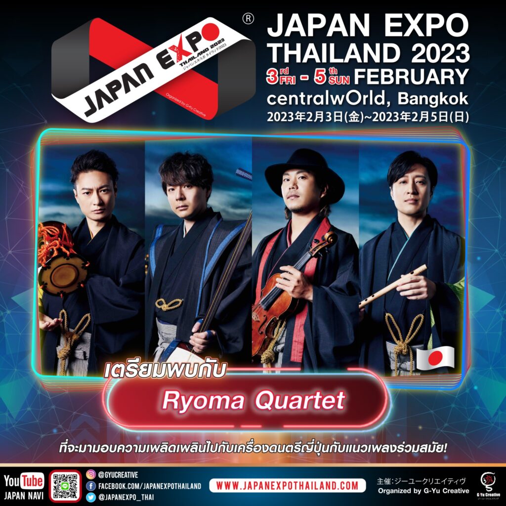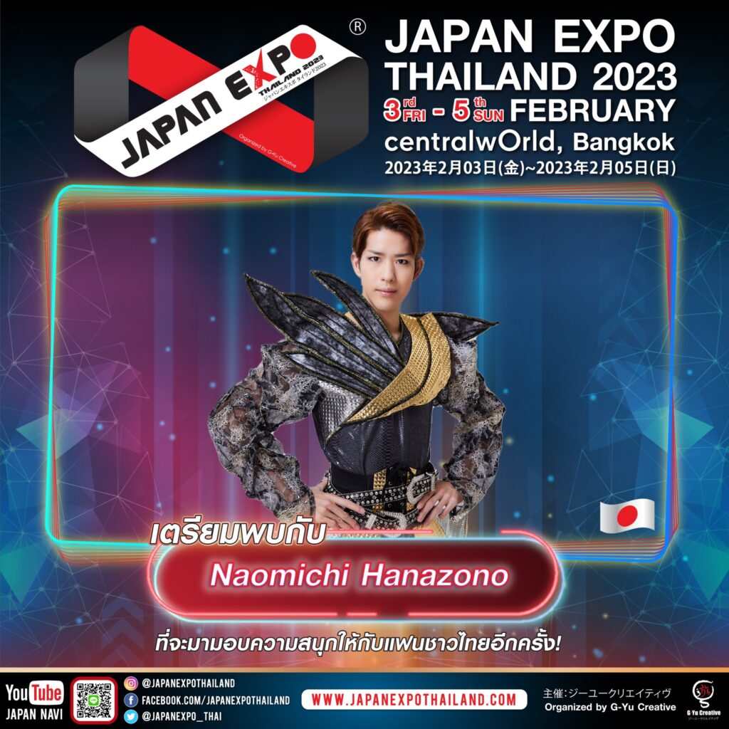 ห่างหายกันไปหลายปี สำหรับศิลปินจากแดนอาทิตย์อุทัยอย่าง Naomichi Hanazono (นาโอมิจิ ฮานาโซโนะ) และศิลปินกลุ่ม Ryoma Quartet (เรียวมะ ควอเทท) ที่แอบขโมยหัวใจสาวไทยและหนุ่มไทยกันไปเมื่อหลายปีก่อน กลับมาคราวนี้จัดหนัก จัดเต็ม เพื่อให้แฟนๆ ชาวไทยได้หายคิดถึงกัน และเป็นการฉลองครบรอบ 8 ปี มหกรรมญี่ปุ่นที่ยิ่งใหญ่ที่สุดในเอเชีย! JAPAN EXPO THAILAND 2023 จัดโดย บริษัท จี-ยู ครีเอทีฟ จำกัด บริษัทอีเว้นท์ญี่ปุ่นที่ยิ่งใหญ่ที่สุดในเอเชีย ภายใต้ธีม EMPOWER INFINITY การเสริมพลังซึ่งกันและกันอย่างไม่มีที่สิ้นสุด ด้วยความร่วมมือระหว่างประเทศไทยและญี่ปุ่นที่ทุกคนรอคอย!!! ที่จะขึ้นตลอด 3 วันเต็ม ระหว่างวันศุกร์ที่ 3 – วันอาทิตย์ที่ 5 กุมภาพันธ์ 2566 ณ ศูนย์การค้าเซ็นทรัลเวิลด์