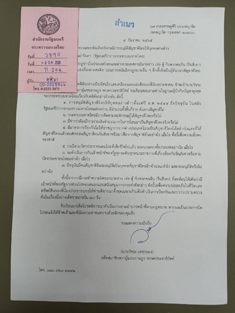 - มีมาตรการป้องกันไม่ให้อาชญากรจากต่างประเทศโอนเป็นสัญชาติไทยได้อย่างไรและที่ได้สัญชาติไทยแล้วจะเพิกถอนสัญชาติคนจีนสีเทาหรือมาเฟียจากสัญชาติอื่นอย่างไร เมื่อใด ทั้งนี้เพื่อความมั่นคงของชาติ
