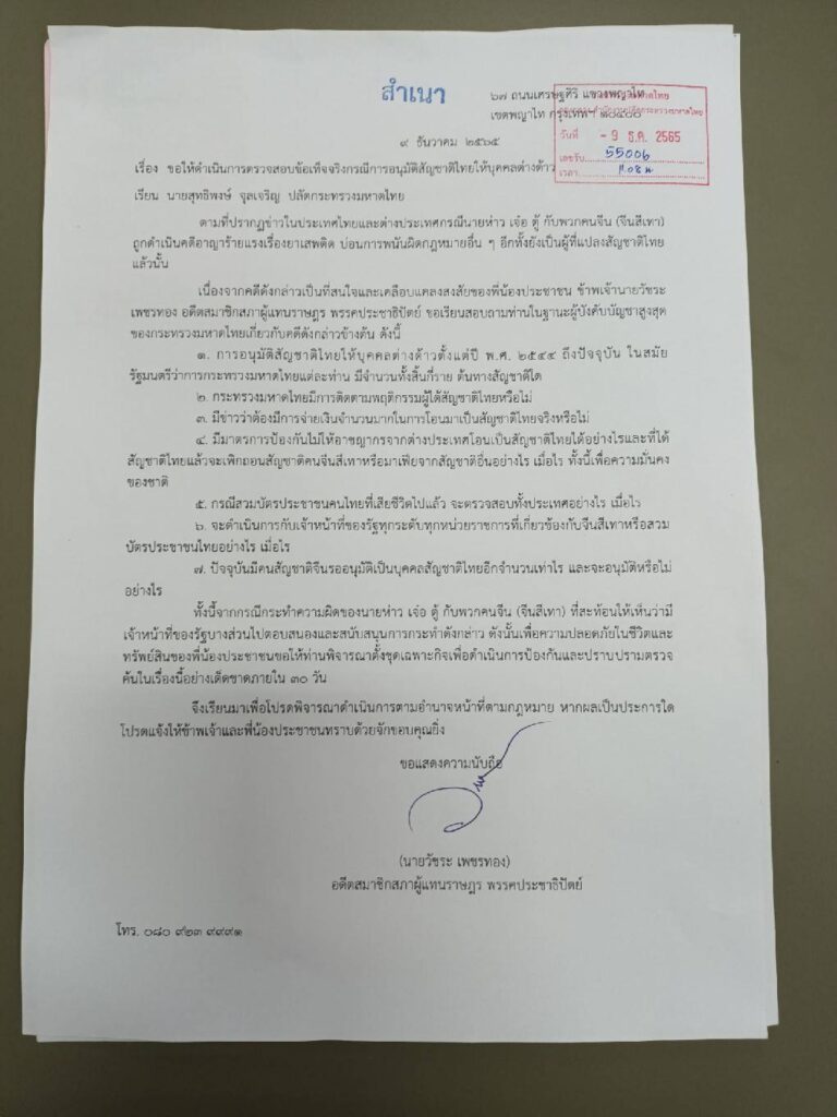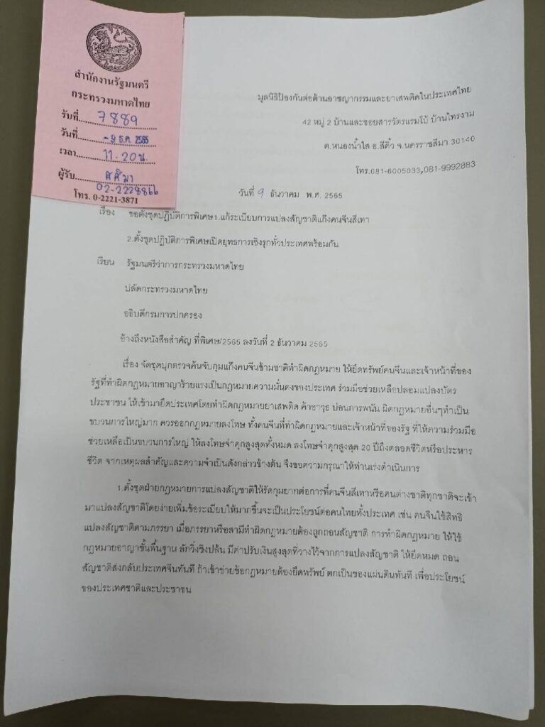 (9 ธ.ค.65)เมื่อเวลา 11.40 น.ที่กระทรวงมหาดไทย นายวัชระ เพชรทอง อดีตส.ส.พรรคประชาธิปัตย์และพ.ต.อ. สุรโชค เจษฎาเดช (สารวัตรแรมโบ้)ประธานมูลนิธิป้องกันต่อต้านอาชญากรรมและยาเสพติดในประเทศไทย ยื่นหนังสือผ่านนายพรพจน์ เพ็ญพาส รองปลัดกระทรวงมหาดไทยถึงพล.อ.อนุพงศ์ เผ่าจินดารมว.มหาดไทย นายสุทธิพงศ์ จุลเจริญ ปลัดกระทรวงมหาดไทยและ