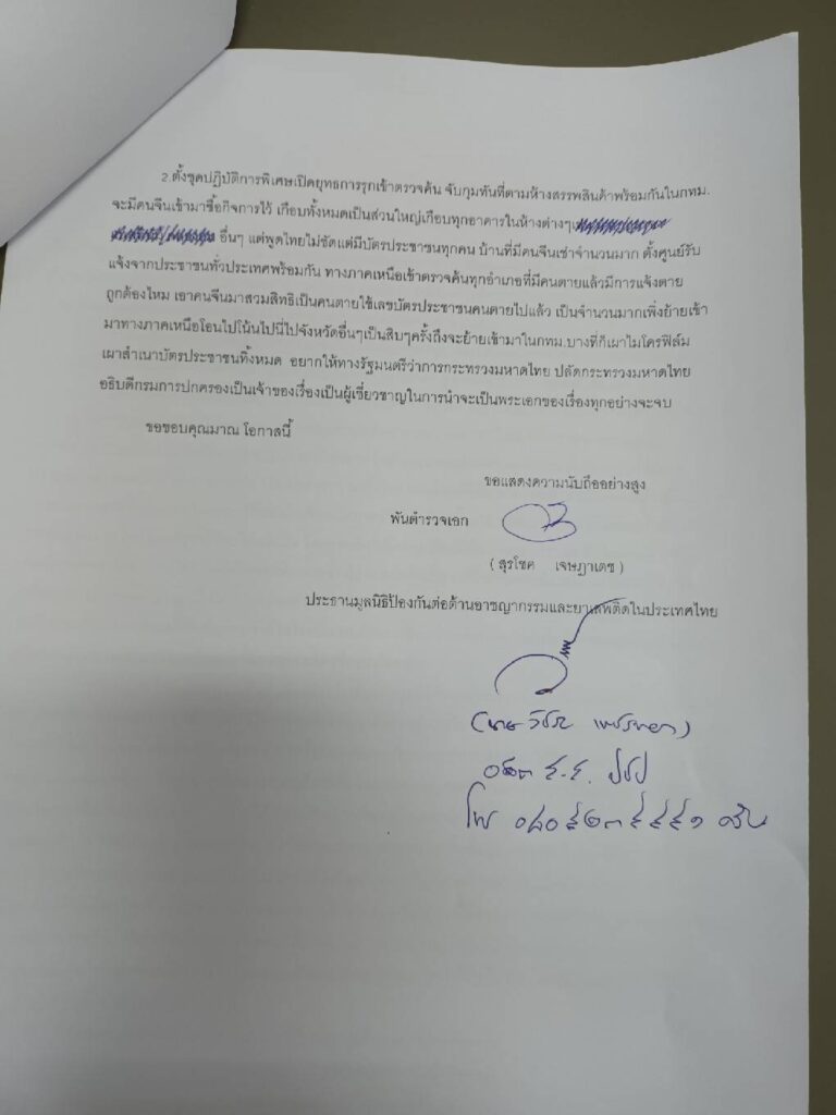ทั้งนี้จากกรณีกระทำความผิดของนายห่าว เจ๋อ ตู้ กับพวกคนจีน (จีนสีเทา) สะท้อนให้เห็นว่ามีเจ้าหน้าที่ของรัฐบางส่วนไปตอบสนองและสนับสนุนการกระทำดังกล่าว ดังนั้นเพื่อความปลอดภัยในชีวิตและทรัพย์สินของประชาชนขอให้พิจารณาตั้งชุดเฉพาะกิจเพื่อดำเนินการป้องกันและปราบปรามตรวจค้นในเรื่องนี้อย่างเด็ดขาดภายใน 30 วัน