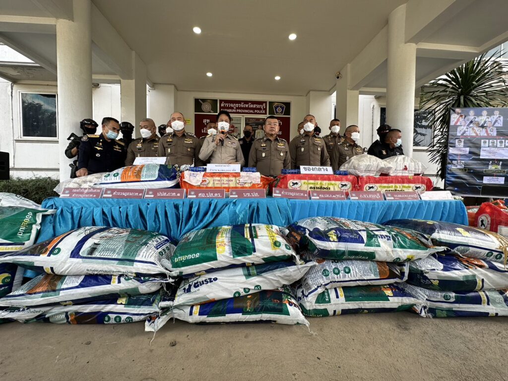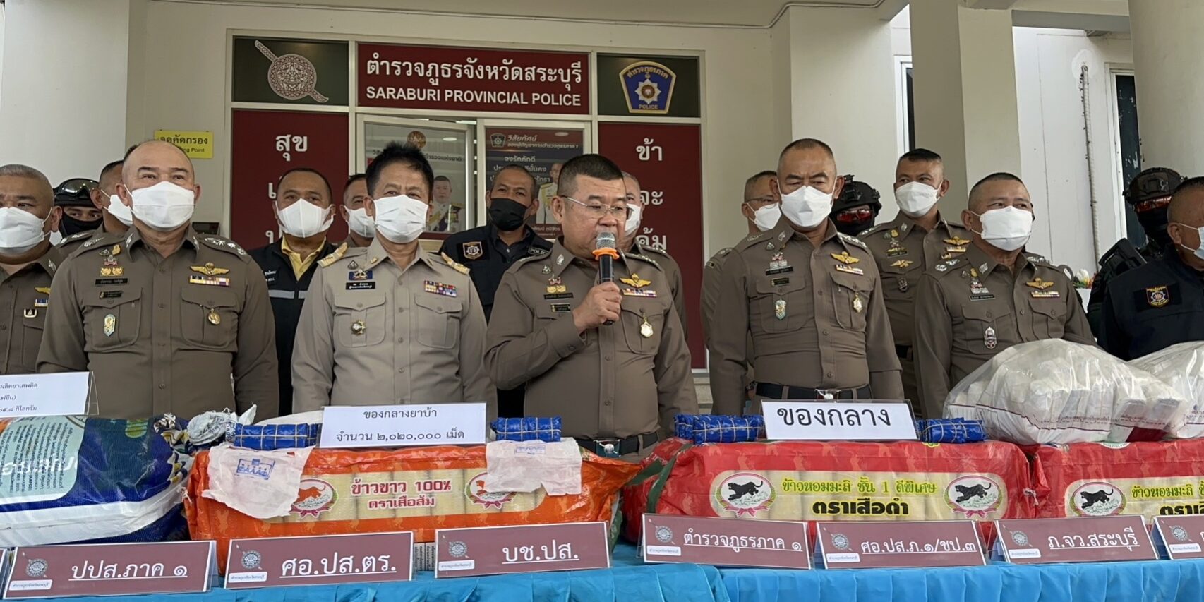 วันที่ 9 ธ.ค.65 เวลา 13.30 น. พล.ต.อ.ดำรงศักดิ์ กิตติประภัสร์ ผบ.ตร. พร้อมด้วย พล.ต.ท.ประจวบ วงศ์สุข ผู้ช่วย ผบ.ตร. ,พล.ต.ท.นิรันดร เหลื่อมศรี ผู้ช่วย ผบ.ตร. ,นายผล ดำธรรม ผู้ว่าราชการจังหวัดสระบุรี ,พล.ต.ท.จิรพัฒน์ ภูมิจิตร ผบช.ภ.1,นายประสาร หยงสตาร์ ผอ.ปปส.ภาค1,พล.ต.ต.วิชิต บุญชินวุฒิกุล ผบก.ภ.จ.สระบุรี ร่วมแถลงผลการจับกุมเครือข่ายยาเสพติด “คิงส์โพธิ์ดำ” จับกุมตัวผู้ต้องหาทั้งหมดได้ จำนวน 9 ราย ยึดยาบ้า จำนวน 2,220,150 เม็ด ตรวจยึดสารตั้งต้นที่เชื่อว่าใช้ในการผลิตยาเสพติดประเภทเมทแอมเฟตามีน (คาเฟอีน/กาเฟอีน) น้ำหนักประมาณ 1,908.5 กิโลกรัม (ซึ่งสามารถใช้ในการผลิตยาบ้าได้ประมาณ 30 ล้านเม็ด) ตรวจยึดอายัดทรัพย์สินรวมมูลค่าประมาณ 3 ล้านบาท ณ ตำรวจภูธรจังหวัดสระบุรี