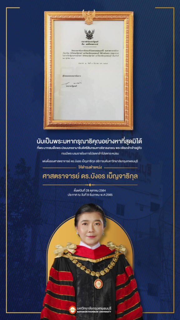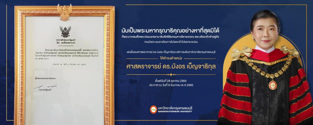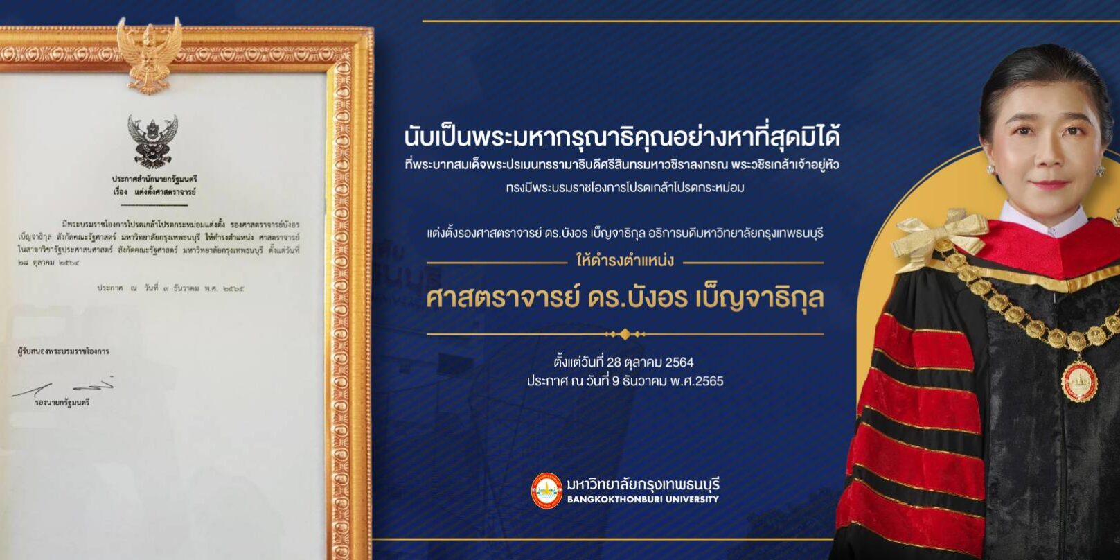 ประกาศสำนักนายกรัฐมนตรี เรื่องตั้งแต่ศาสตราจารย์ โดยมีพระบรมราชโองการโปรดเกล้าโปรดกระหม่อมแต่งตั้ง รองศาสตราจารย์ดร.บังอร เบ็ญจาธิกุล สังกัดคณะรัฐศาสตร์ มหาวิทยาลัยกรุงเทพธนบุรี ให้ดำรงตำแหน่ง ศาสตราจารย์ในสาขาวิชารัฐประศาสนศาสตร์ สังกัดคณะรัฐศาสตร์ มหาวิทยาลัยกรุงเทพธนบุรี ตั้งแต่วันที่ ๒๘ ตุลาคม ๒๕๖๔