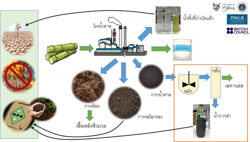 แสงสว่างที่ปลายทาง รัฐบาลไทยมุ่งพัฒนาประเทศไปสู่การเติบโตอย่างยั่งยืนตามเป้าหมายขององค์กรสหประชาชาติโดยขับเคลื่อนเศรษฐกิจชีวภาพ เศรษฐกิจหมุนเวียน เศรษฐกิจสีเขียว หรือ Bio-Circular Green Economy (BCG) อุตสาหกรรมน้ำตาลเป็นหนึ่งในอุตสาหกรรมที่มีศักยภาพในการขับเคลื่อน BCG โดยผลพลอยได้จากอุตสาหกรรมสามารถนำไปใช้ในภาคการผลิตพลังงาน เช่น เอทานอลจากกากน้ำตาล เชื้อเพลิงแข็งจากชีวมวลกากอ้อย หรือก๊าซชีวมวลจากการหมักน้ำกากส่า ผลพลอยได้ส่วนอื่น เช่น กากหม้อกรอง น้ำกากส่าที่ผ่านการหมัก ก็ยังสามารถนำไปใช้เพิ่มผลผลิตในภาคการเกษตรกรรมเพื่อลดการพึ่งพาปุ๋ยเคมีและปรับปรุงดิน มีหลายงานวิจัยที่แสดงให้เห็นว่าการใช้ประโยชน์จากผลพลอยได้จากโรงงานน้ำตาลสามารถเพิ่มคุณค่าทางเศรษฐกิจได้