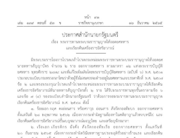ราชกิจจานุเบกษา วันที่ 16 ธ.ค.2565 เผยแพร่ประกาศสำนักนายกรัฐมนตรีเรื่อง พระราชทานพระบรมราชานุญาตให้ถอดยศทหารและเรียกคืนเครื่องราชอิสริยาภรณ์ 2 ราย เนื่องจากกระทำผิดฐานต้องหาในคดีอาญา ผิดวินัยทหารฐานประพฤติชั่วอย่างร้ายแรง และ โปรดกระหม่อมพระราชทานพระบรมราชานุญาตให้ถอดยศข้าราชการตำรวจ ออกจากยศตำรวจ จำนวน 11 ราย