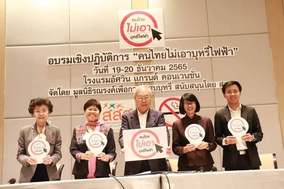 โดยมีวิทยากร รศ.ดร.พญ.เริงฤดี ปธานวนิช อาจารย์จากภาคเวชศาสตร์ชุมชน คณะแพทยศาสตร์ โรงพยาบาลรามาธิบดี ศ.พญ.สุวรรณา เรืองกาญจนเศรษฐ์ รองผู้อำนวยการศูนย์วิจัยและจัดการความรู้เพื่อการควบคุมยาสูบ (ศจย.) รู้กฎหมายเรื่องบุหรี่ไฟฟ้าที่เกี่ยวข้อง โดยนายอดิศักดิ์ พุ่มทอง นิติกรกองงานคณะกรรมการควบคุมผลิตภัณฑ์ยาสูบ กรมควบคุมโรค กระทรวงสาธารณสุข และเหตุผลว่าทำไมต้องรณรงค์ “คนไทยไม่เอาบุหรี่ไฟฟ้า” โดยคุณบังอร ฤทธิภักดี เลขาธิการมูลนิธิรณรงค์เพื่อการไม่สูบบุหรี่ ตอบทุกข้อสงสัยเรื่องบุหรี่ไฟฟ้ากับ ศ.นพ.ประกิต วาทีสาธกกิจ ประธานมูลนิธิรณรงค์เพื่อการไม่สูบบุหรี่