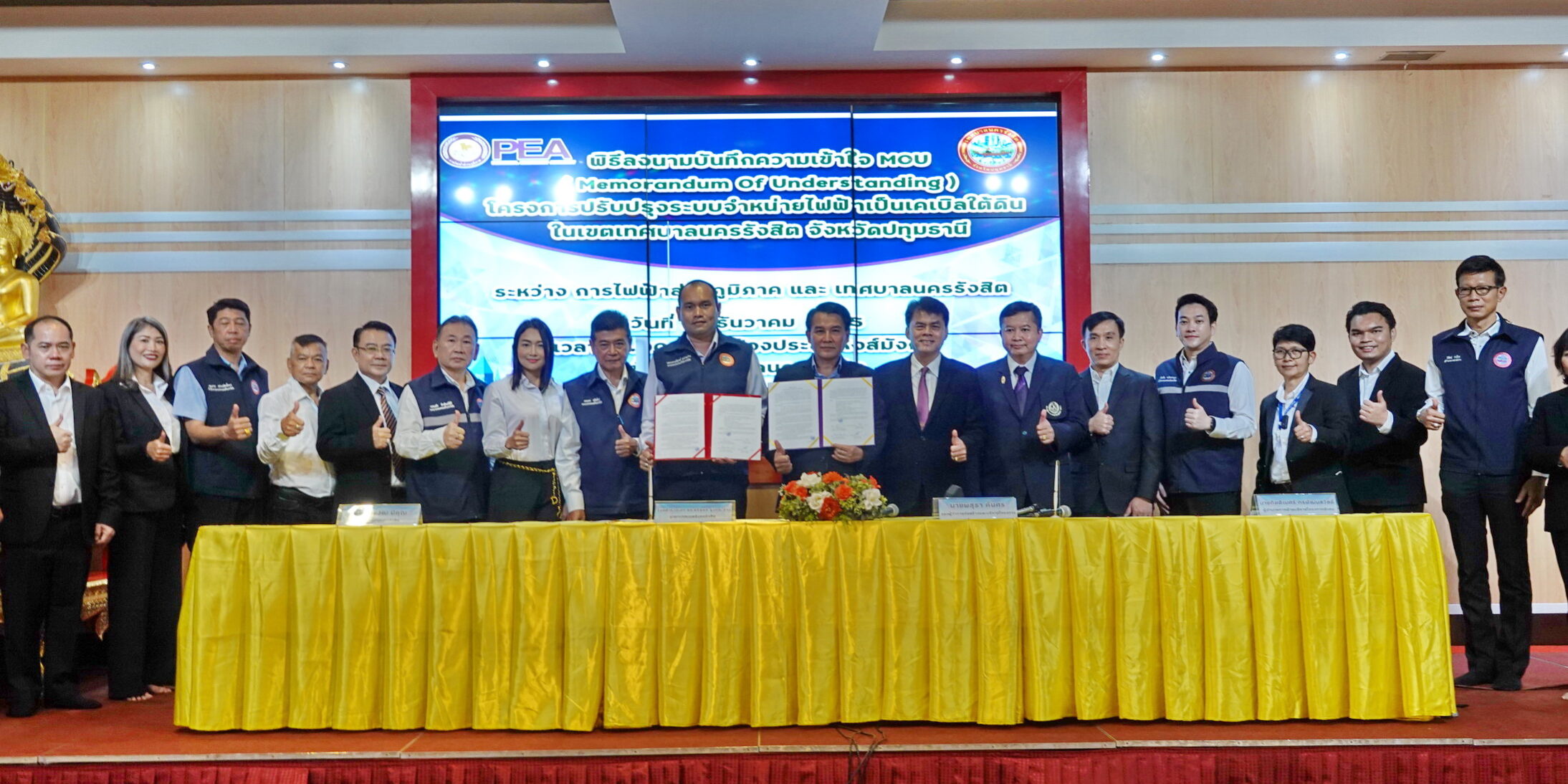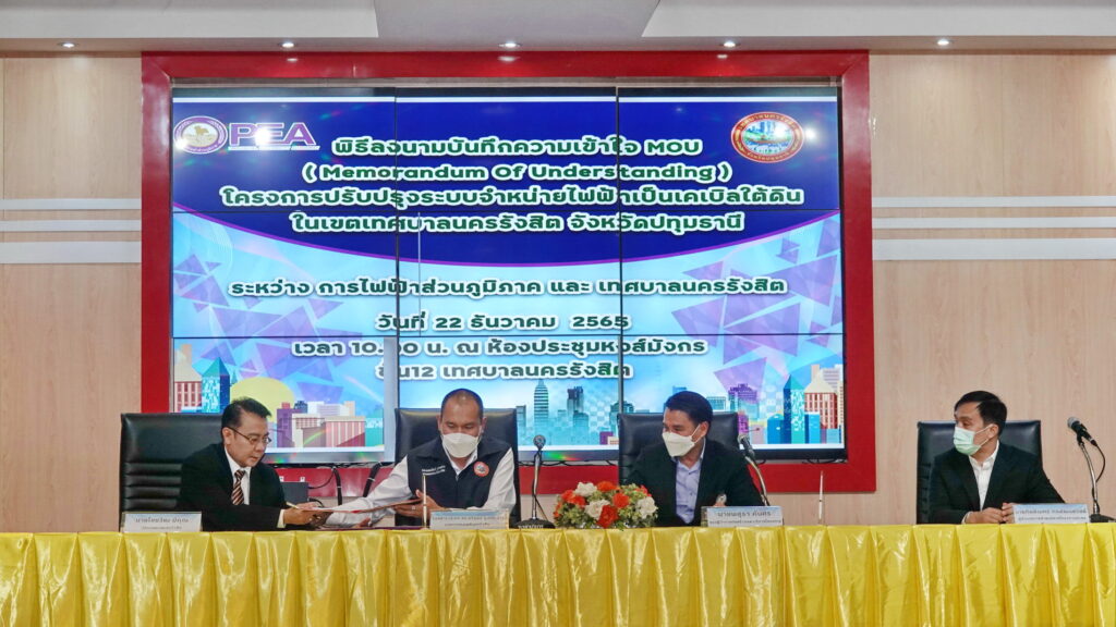 เมื่อเวลา 10.00 น. วันที่ 22 ธันวาคม 2565 ที่ชั้น 12 เทศบาลนครรังสิต ตำบลประชาธิปัตย์ อำเภอธัญบุรี จังหวัดปทุมธานี ร้อยตำรวจเอก ดร.ตรีลุพธ์ ธูปกระจ่าง นายกเทศมนตรีนครรังสิต และ นายพสุธา คันศร รองผู้ว่าการก่อสร้างและบริหารโครงการ การไฟฟ้าส่วนภูมิภาค (PEA) ได้ร่วมลงนามบันทึกความเข้าใจ (Memorandum of Understanding หรือ MOU) ดำเนินโครงการปรับปรุงระบบจำหน่ายไฟฟ้าเป็นเคเบิลใต้ดิน โดยมี นายไชยวัฒ มีคุณ ปลัดเทศบาลนครรังสิต และ นายกัตติเมศร์ กรพัฒนสวัสดิ์ ผู้อำนวยการฝ่ายบริหารโครงการพิเศษ การไฟฟ้าส่วนภูมิภาค (PEA) และผู้บริหารเทศบาลนครรังสิต ร่วมเป็นสักขีพยาน