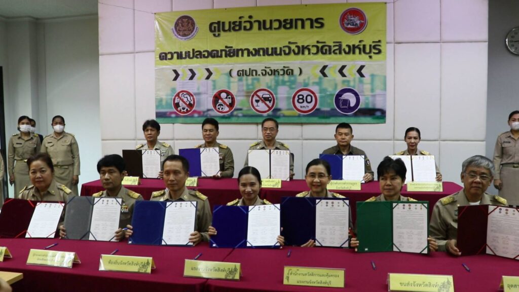 วันที่ 22 ธันวาคม 2565 เวลา 8.30 น.นายสุพจน์ ยศสิงห์คำ ผู้ว่าราชการจังหวัดสิงห์บุรี เป็นประธานในพีธีลงนามบันทึกข้อตกลง MOU ว่าด้วยการป้องกันและลดอุบัติเหตุทางถนนจากการไม่สวมหมวกนิรภัย 100 % โดยร่วมกับหน่วยงานที่เกี่ยวข้อง 12 หน่วยงานศูนย์อำนวยการความปลอดภัยทางถนนจังหวัดสิงห์บุรี นางนงเยาว์ สว่างกลับ ป้องกันและบรรเทาสาธารณภัยจังหวัดสิงห์บุรี ตำรวจภูธรจังหวัดสิงห์บุรี ปกครองจังหวัดสิงห์บุรี ท้องถิ่นจังหวัดสิงห์บุรี แรงงานจังหวัดสิงห์บุรี สวัสดิการและคุ้มครองแรงงานจังหวัดสิงห์บุรี อุตสาหกรรมจังหวัดสิงห์บุรี สำนักงานสาธารณสุขจังหวัดสิงห์บุรี ขนส่งจังหวัดสิงห์บุรี สำนักงานศึกษาธิการจังหวัดสิงห์บุรี และสำนักงานเขตพื้นที่การศึกษามัธยมศึกษาสิงห์บุรี อ่างทอง ร่วมลงนามบันทึกข้อตกลงป้องกันและลดอ 1.ให้จัดทำมาตรการองค์กรกำกับบุลากรในสังกัดปฏิบัติตามกฏจราจรและระเบียบกฏหมายที่เกี่ยวข้องอย่างเคร่งครัดในการใช้รถใช้ถนนตามมาตรการ 10 รสขม คือ 1 ร ไม่ขับรถเร็วเกินกฏหมายกำหนด 2 ส.ไม่ฝ่าฝืนสัญญาณไฟจราจร ไม่ขับรถย้อนศร 3 ข. คาดเข็มขัดนิรภัย พกใบขับขี่ ไม่แซงในที่คับขัน 4 ม.เมาไม่ขับ สวมหมวกนิรภัย ไม่ดัดแปลงรถมอเตอร์ไซด์ ไม่ใช้มือถือขณะขับขี่ 2.ให้กำกนดพื้นที่ตั้งหน่วยงาน สถานประกอบการเป็นพื้นที่สวมหมวกนิรภัย 100 เปอร์เซ็นต์ ขณะขับขี่และซ้อนท้ายรถจักรยานยนต์พร้อมทั้งนำเทคโนโลยีมาสนับสนุนการบังคับใช้กฏหมายอย่างเข้มงวดจริงจัง 3.ให้มีการกำหนดมาตรการมิให้บุลากรในสังกัดขับขี่รถขณะเมาสุราทุกกรณี