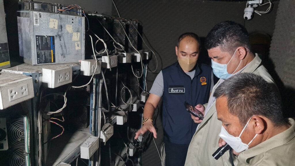 สืบเนื่องจากกรณีเมื่อวันที่ 13 ธันวาคมที่ผ่านมาเจ้าหน้าที่การไฟฟ้าเขตบางขุนเทียนเข้าแจ้งความร้องทุกข์ต่อพนักงานสอบสวนสน.ท่าข้าม หลังพบว่ามีการลักลอบใช้ไฟฟ้าหลวง ซึ่งก่อนหน้านี้เมื่อวันที่ 16 ธันวาคมที่ผ่านมาเจ้าหน้าที่ได้ทำการเข้าตรวจยึดพบของกลางจำนวนมาก จากการขยายผลพบว่า ยังมีการลักลอบใช้ไฟฟ้าอีกบางส่วน ต่อมาช่วงบ่ายของวันนี้ 22 ธันวาคม จึงขออนุมัติศาลอาญาธนบุรีเพื่อเข้าตรวจค้น บ้านจำนวน 4 หลัง ซึ่งบ้านหลังดังกล่าวมีการล็อคแม่กุญแจ ไว้เจ้าหน้าที่จึงต้องทำการใช้คีมตัดเหล็กขนาดใหญ่เข้าทำการตัดกุญแจเพื่อเข้าไปตรวจสอบจนพบของกลางเป็นอุปกรณ์เครื่องขุดบิตคอยล์ จำนวนกว่า 100 เครื่อง ซึ่งเจ้าหน้าที่เชื่อว่ามีการลักลอบใช้ไฟฟ้ามาประมาณ 2 ปีส่วนความเสียหายที่พบการลักลอบใช้ไฟฟ้าจำนวน 4 หลัง ตก 1 หลังราคา 2 ล้านต่อเดือน 4 หลังรวมเป็นมูลค่า 8 ล้านต่อเดือน หากคิดเป็นจำนวน 2 ปี จะมีมูลค่าความเสียหายรวม 192 ล้านบาท