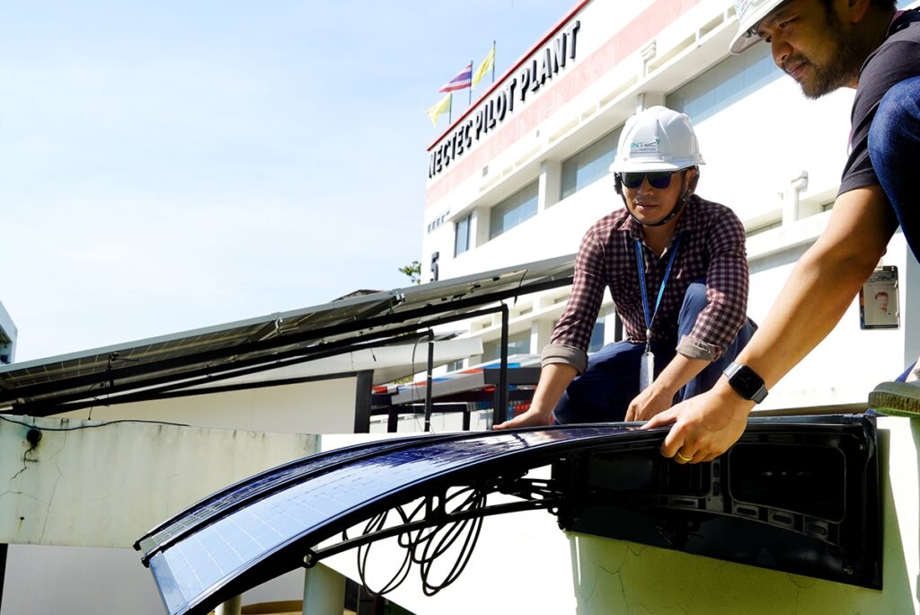 สำนักงานพัฒนาวิทยาศาสตร์และเทคโนโลยีแห่งชาติ (สวทช.) โดยศูนย์เทคโนโลยีพลังงานแห่งชาติ (เอ็นเทค) พัฒนานวัตกรรม “ซันการ์ดพีวี (SunGuard PV) หรือ กันสาดโซลาร์” แผงโซลาร์เซลล์แบบใหม่ ที่มีน้ำหนักเบา โค้งงอได้ เหมาะสำหรับใช้เป็นกันสาดและติดตั้งได้ทันที