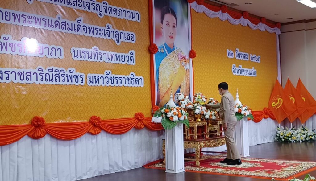 วันที่ 22 ธันวาคม 2565 เวลา 09.00 น. : พ.อ.สุรพงษ์ ยอดอินทร์ รอง ผอ.รมน.จังหวัดขอนแก่น(ท.) มอบหมายให้ พ.ท.ทองใส ใบศรี หน.บค.กอ.รมน.จังหวัดขอนแก่น ร่วมพิธีเจริญพระพุทธมนต์และเจริญจิตตภาวนาเพื่อถวายพระพรแด่ สมเด็จพระเจ้าลูกเธอ เจ้าฟ้าพัชรกิติยาภา นเรนทิราเทพยวดี กรมหลวงราชสารินีสิริพัชร มหาวัชรราชธิดา เพื่อให้ทรงหายจากพระอาการประชวร ณ ห้องประชุมแก่นเมือง 1 ศาลากลางจังหวัดขอนแก่น