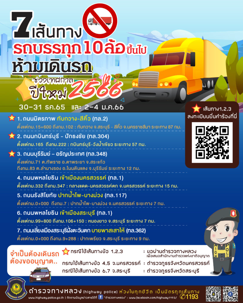 กองบังคับการตำรวจทางหลวง จึงได้เตรียมความพร้อมในการอำนวยความสะดวก และดูแล ความปลอดภัยให้กับพี่น้องประชาชนในการเดินทางกลับภูมิลำเนา ในช่วงเทศกาลปีใหม่ 2566 ตามนโยบายของสำนักงานตำรวจแห่งชาติ และกองบัญชาการตำรวจสอบสวนกลาง ซึ่งต้องการให้ประชาชนเดินทางได้โดยสะดวก และปลอดภัย โดยได้ประสานกรมทางหลวงในการคืนพื้นผิวการจราจรในจุดซ่อมสร้างต่างๆ ในช่วงเทศกาลปีใหม่ 2566 พร้อมขอความร่วมมือผู้ประกอบการรถบรรทุกในการงดเดินรถบรรทุกใน 7 เส้นทาง ระหว่างวันที่ 30-31 ธ.ค.65 และระหว่างวันที่ 2-4 ม.ค.66