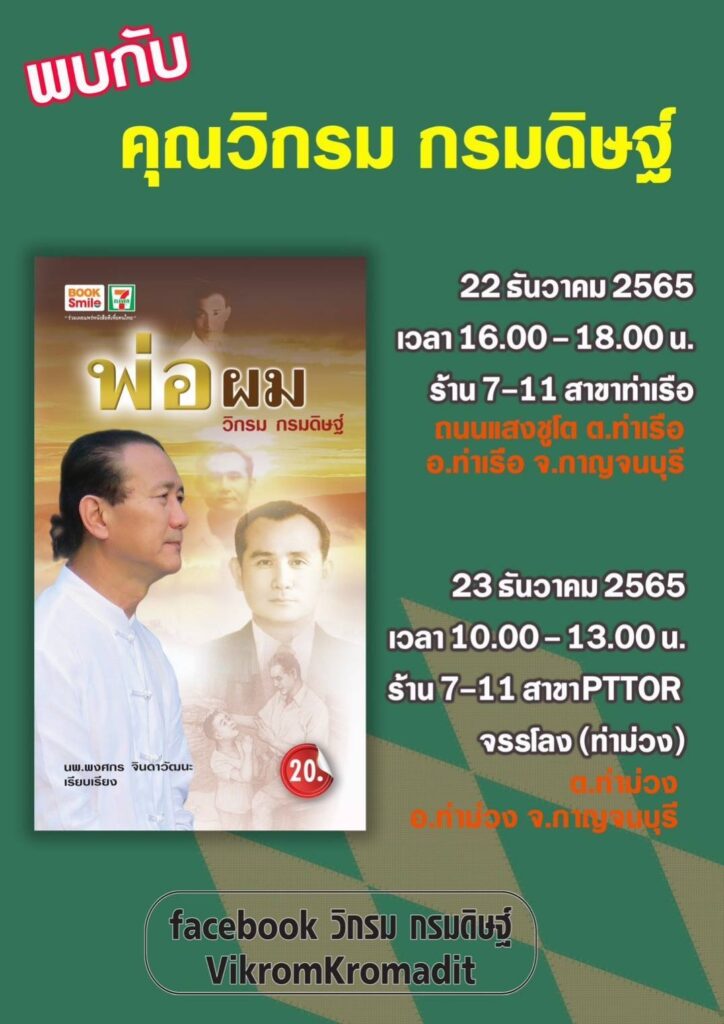 หนังสือเล่มนี้มีจุดมุ่งหวังว่า เมื่อทุกท่านได้อ่านแล้วจะไม่ยอมปล่อยให้โอกาสซึ่งอาจจะเหลือเพียงครั้งเดียวในชีวิตหลุดลอยไป โดยเฉพาะท่านที่ยังมี “พ่อ” ขอให้ดูแล เอาใจใส่ และสะสางความรู้สึกต่างๆ ที่ยังค้างคาอยู่ในใจ ก่อนที่ทุกอย่างจะสายเกินไป และไม่สามารถเรียกกลับมาได้อีกเลย สำหรับผู้ที่สนใจ สามารถติดตามและหาซื้อหนังสือ “พ่อผม” ได้แล้ว รวมทั้งติดตามข้อมูลข่าวสารกิจกรรมคาราวานพบปะแฟนคลับระหว่างวันที่ 22 ธ.ค. 65 – 14 ม.ค. 66 ได้ที่ www.facebook.com/VikromKromadit