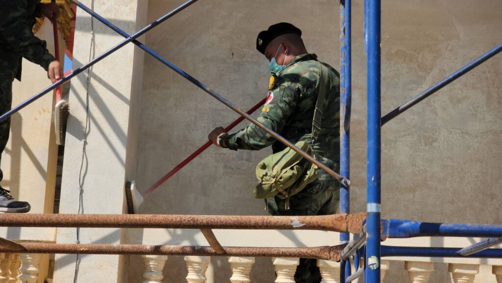 ร่วมด้วย จนท.กองช่าง อบต.คำน้ำแซ่บ,กำลังทหาร ร.6 พัน 2 : 15 คน,ประชาชนจิตอาสา ช่วยกันทำความสะอาดทาสี ที่ วัดช่างหม้อ เป็นที่แรกคาดว่าใช้เวลา 3-4 วัน