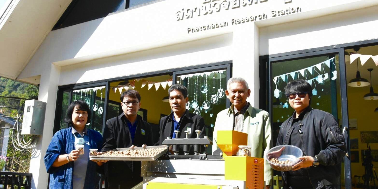 นางสาวริยา ด่อนศรี ทีมนักวิจัย กล่าวว่า (วช.) ได้มีการนำนวัตกรรมจากโครงการเพิ่มศักยภาพการผลิตและยกระดับรายได้ชุมชนด้วยนวัตกรรมเครื่องสีเปลือกแมคคาเดเมีย ต่อยอดจากโครงการเดิม โครงการพัฒนามาตรฐานการผลิตแมคคาเดเมียอบแห้งสำหรับชุมชน ซึ่งนำไปสู่การเพื่อเพิ่มมูลค่าสำหรับชุมชนในพื้นที่ตั้งของสถานีวิจัยเพชรบูรณ์ 2 แห่ง 1) บ้านเข็กน้อย ตำบลเข็กน้อย อำเภอเขาค้อ และ 2) บ้านทับเบิก ตำบลวังบาล อำเภอหล่มเก่า จังหวัดเพชรบูรณ์ เพื่อเป็นแหล่งเรียนรู้ ด้านเทคโนโลยีการผลิตและแปรรูปแมคคาเดเมียแบบครบวงจรที่มีมาตรฐานเป็นที่ยอมรับสำหรับเกษตรกรในชุมชนและบุคคลที่สนใจได้เข้ามาเรียนรู้รวมถึงการส่งเสริมการแปรรูปผลผลิตแทนการจำหน่ายผลผลิต โดยกระบวนการแปรรูปแมคคาเดเมียเริ่มตั้งแต่การเก็บผลร่วงจากต้น การกะเทาะเปลือก การผึ่ง การอบ การกะเทาะกะลา และการอบก่อนบรรจุลงภาชนะสำหรับจำหน่ายจำเป็นต้องใช้เครื่องมือกะเทาะเมล็ดแมคคาเดเมียที่เหมาะสำหรับกลุ่มเกษตรกร หรือเกษตรกรรายย่อยสำหรับใช้ในการแปรรูป จึงได้คิดค้นเครื่องกะเทาะเมล็ดแมคคาเดเมีย ซึ่งใช้เครื่องบรรจุภัณฑ์เมล็ดแมคคาเดเมียเพื่อยืดอายุของสินค้าและสร้างมูลค่าให้แก่เกษตรกรในกระบวนการการแปรรูปแมคคาเดเมีย ลักษณะการใช้งาน คือ เมื่อนำผลกะลาแมคคาเดเมียใส่เข้าด้านบนของเครื่องกะเทาะ ผลกะลาแมคคาเดเมียจะตกลงไปภายในเครื่องมีแกนหมุนเพื่อให้ผลกะลาที่ตกลงไปกระทบกับชุดใบมีดสำหรับการกะเทาะผลกะลาให้แตก จากนั้นกะลาและเนื้อในที่แยกออกจากกันตกลงสู่ถาดรองรับภายนอกเครื่องกะเทาะและนำไปสู่กระบวนการอื่นต่อไป และเป็นศูนย์กลางในการรับซื้อแมคคาเดเมียจากเกษตรกรในชุมชนมาแปรรูปต่อ โดยการแปรรูปเป็นผลิตภัณฑ์ที่หลากหลายช่วยเพิ่มทางเลือกให้ผู้บริโภคและเพิ่มมูลค่าสินค้า อีกทั้งยังลดปริมาณวัสดุเหลือใช้ทางการเกษตรด้วยการแปรรูปเป็นผลิตภัณฑ์ที่สร้างมูลค่าสร้างรายได้ให้กับเกษตรกรได้อย่างยั่งยืน