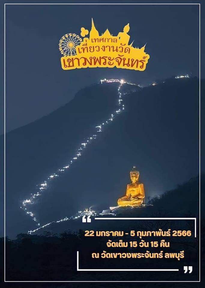 การท่องเที่ยวแห่งประเทศไทย (ททท.) สำนักงานลพบุรี ขอเชิญร่วมงาน “เทศกาลงานวัดเขาวงพระจันทร์” สักการะรอยพระพุทธบาท และหลวงพ่อพุทธโชค ในระหว่างวันที่ 22 มกราคม – 5 กุมภาพันธ์ 2566 (15 วัน 15 คืน) ณ วัดเขาวงพระจันทร์ อำเภอโคกสำโรง จังหวัดลพบุรี