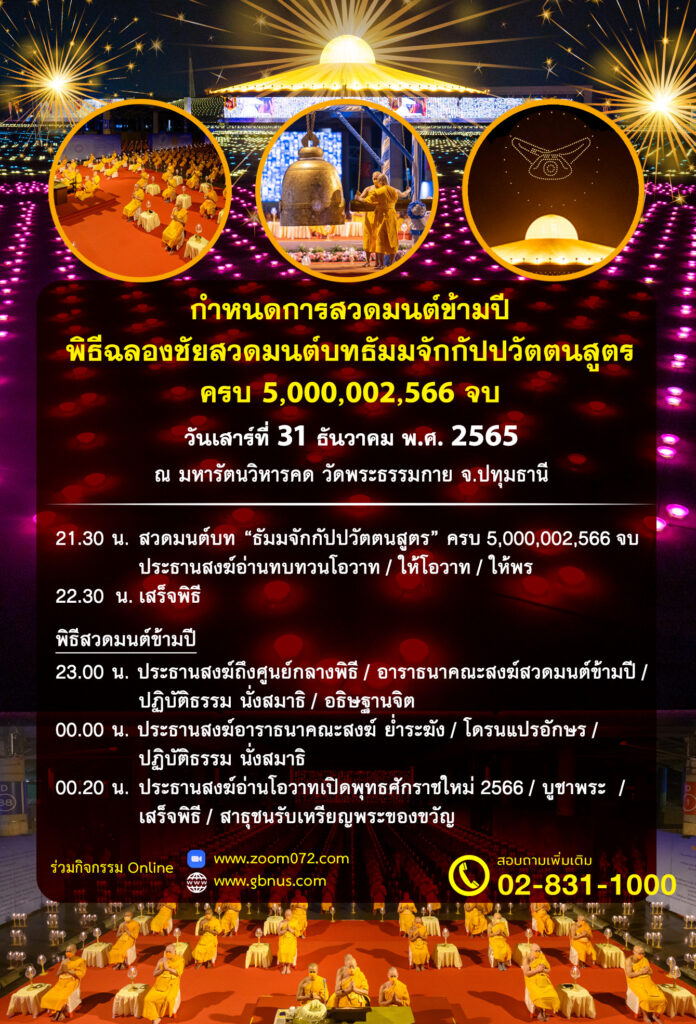 “ขอเชิญพุทธศาสนิกชนมาร่วมงานบุญส่งท้ายปีเก่าต้อนรับปีใหม่ได้ที่วัดพระธรรมกาย ในคืนวันที่ 31 ธ.ค. 65 และ วันที่ 1 ม.ค. 66 เพื่อสร้างบุญต้อนรับศักราชใหม่ให้เป็นสิริมงคลในการดำเนินชีวิตในปีใหม่ต่อไปอย่างมีความสุข หรือสามารถร่วมงานบุญ และอนุโมทนาผ่านทางออนไลน์ที่ www.zoom072.com และ ทางช่อง GBN” พระครูสมุห์สนิทวงศ์กล่าว