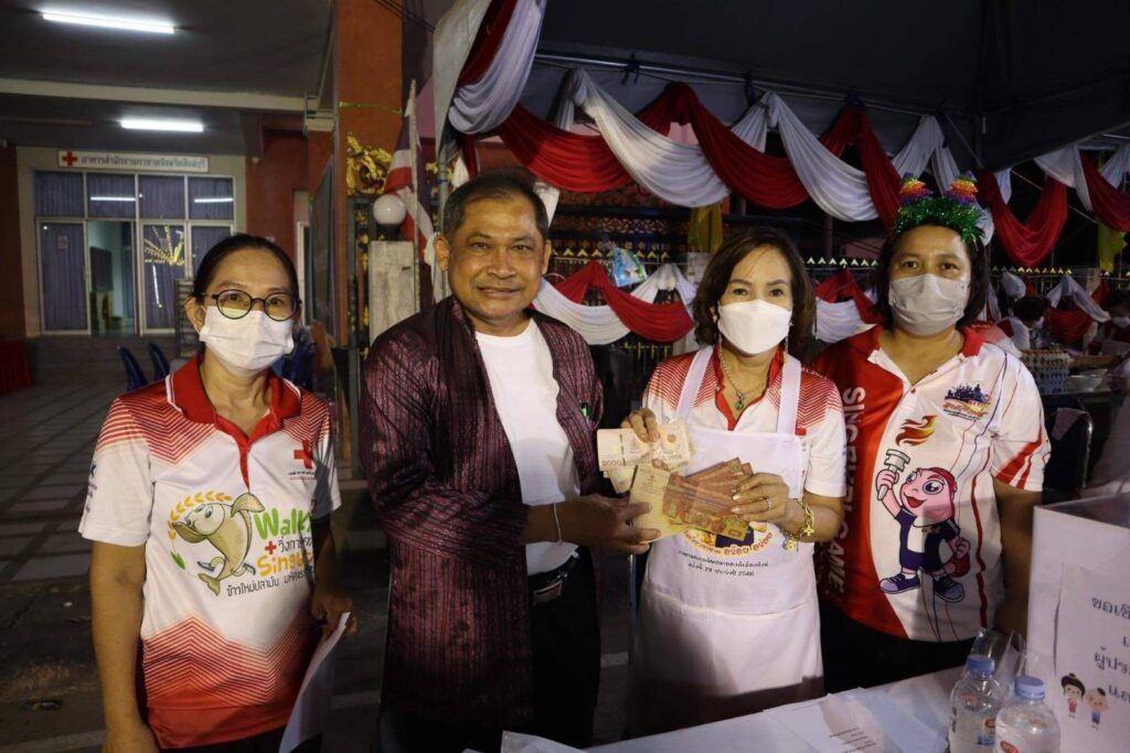นายสุพจน์ ยศสิงห์คำ ผู้ว่าราชการจังหวัดสิงห์บุรี/นายกเหล่ากาชาดจังหวัดสิงห์บุรี มอบหมายให้ นายสัมฤทธิ์ กองเงิน นายสมชาย ลีหล้าน้อย รองผู้ว่าราชการจังหวัดสิงห์บุรี นางจิราภรณ์ กองเงิน นางสาวนัยนา ศรีเร รองนายกเหล่ากาชาดจังหวัดสิงห์บุรี นางภรณี ธนาคมานุสรณ์ กรรมการเหล่ากาชาดจังหวัดสิงห์บุรี ผู้ช่วยนายกเหล่ากาชาดจังหวัดสิงห์บุรี กรรมการ/สมาชิกเหล่ากาชาดจังหวัดสิงห์บุรี และเจ้าหน้าที่เหล่ากาชาดจังหวัดสิงห์บุรี จัดทำข้าวไข่เจียวจำหน่ายให้แก่ผู้มาร่วมงานฯ ทั้งยังจำหน่ายสลากกาชาดการกุศล ของที่ระลึกมือสอง และรับบริจาคดวงตา อวัยวะ