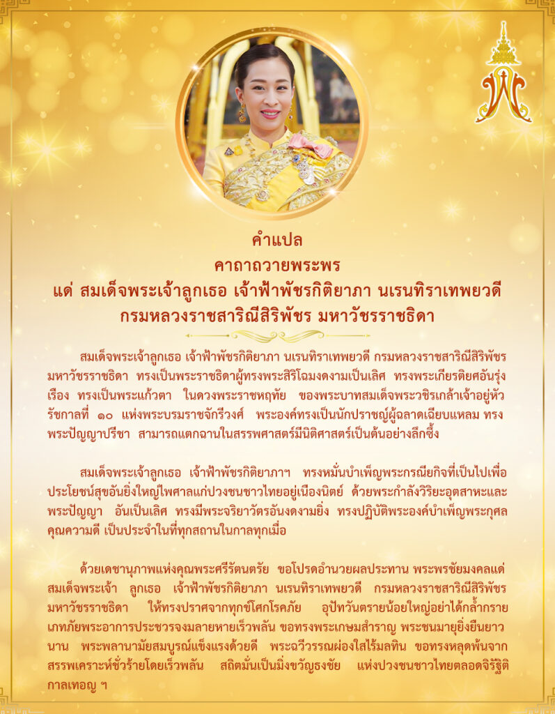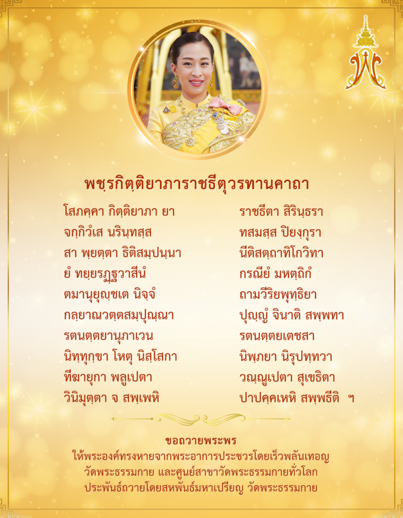 ด้วยเดชานุภาพแห่งคุณพระศรีรัตนตรัย ขอโปรดอำนวยผลประทานพระพรชัยมงคลแด่สมเด็จพระเจ้าลูกเธอ เจ้าฟ้าพัชรกิติยาภา นเรนทิราเทพยวดี กรมหลวงราชสาริณีสิริพัชร มหาวัชรราชธิดา ให้ทรงปราศจากทุกข์โศกโรคภัย อุปัทวันตรายน้อยใหญ่อย่าได้กล้ำกราย เภทภัยพระอาการประชวรจงมลายหายเร็วพลัน ขอทรงพระเกษมสำราญ พระชนมายุยิ่งยืนยาวนาน พระพลานามัยสมบูรณ์แข็งแรงด้วยดี พระฉวีวรรณผ่องใสไร้มลทิน ขอทรงหลุดพ้นจากสรรพเคราะห์ชั่วร้ายโดยเร็วพลัน สถิตมั่นเป็นมิ่งขวัญธงชัยแห่งปวงชนชาวไทยตลอดจิรัฐิติกาลเทอญ ฯ