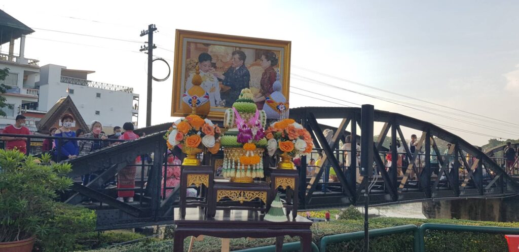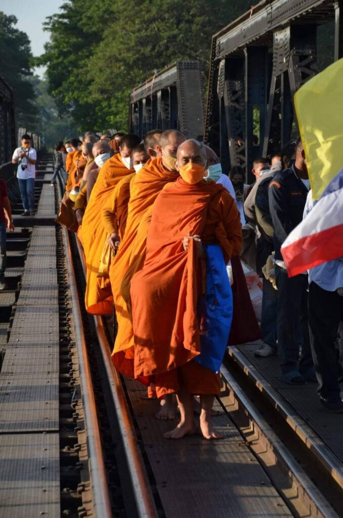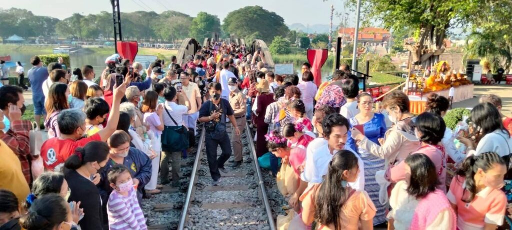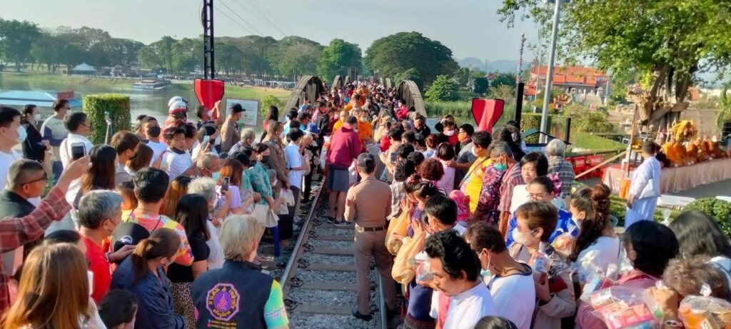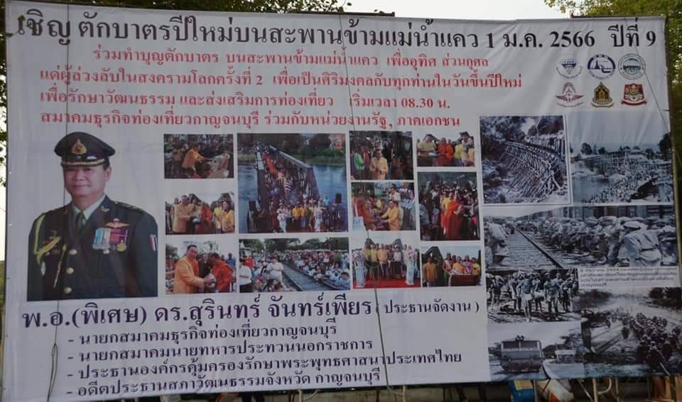 เมื่อวันที่ 1 มกราคม 2566 เวลา 08.30น.ณ.สะพานข้ามแม่น้ำแคว ตำบลท่ามะขาม อำเภอเมือง จังหวัดกาญจนบุรี พันเอกพิเศษ ดร.สุรินทร์ จันทร์เพียรนายกสมาคมธุรกิจท่องเที่ยวจังหวัดกาญจนบุรี.ได้เป็นประธานในพิธีทำบุญตักบาตร ณ.บริเวณสะพานข้ามแม่น้ำแคว เพื่ออุทิศส่วนกุศลให้แด่เชลยศึกและแรงงานที่เสียชีวิต จากการสร้างสะพานข้ามแม่น้ำแควและสร้างทางรถไฟสายมรณะจากไทยที่บ้านหนองปลาดุก อำเภอบ้านโป่ง จังหวัดราชบุรี ประเทศเมียนมาร์เป็นระยะทางประมาณ 415 กิโลเมตรและมีผู้เสียชีวิตในการก่อสร้างทางรถไฟประมาณ 4 แสนกว่าชีวิต ในสมัยสงครามโลกครั้งที่ 2 สมาคมธุรกิจท่องเที่ยวกาญจนบุรี จึงได้ร่วมกับทุกภาคส่วนและหน่วยงานราชการ จัดงานในวาระดิถีขึ้นปีใหม่ 2566 ในวันที่ 1 มกราคม ซึ่งสมาคมธุรกิจท่องเที่ยวฯได้กระทำต่อเนื่องกันมาทุกปีและปีนี้เป็นปีที่ 9 วัตถุประสงค์ของการจัดงานในครั้งนี้ คือทำบุญตักบาตรเพื่อถวายพระพรชัย แด่สมเด็จพระเจ้าลูกเธอ เจ้าฟ้าพัชรกิติยาภา นเรนทิราเทพยวดี กรมหลวงราชสาริณีสิริพัชร มหาวัชรราชธิดาขอให้ทรงหายจากพระอาการประชวรและมีพระพลานามัยแข็งแรง โดยเร็ววันและเพื่ออุทิศส่วนกุศลให้กับเชลยศึกและแรงงานตลอดจนผู้ที่เสียชีวิตในการสร้างสะพานข้ามแม่น้ำแควและทางรถไฟสายมรณะจากหนองปลาดุกอำเภอบ้านโป่งจังหวัดราชบุรีไปยังเมืองการบูชายัดประเทศเมียนมาร์และมีผู้เสียชีวิตในการก่อสร้างเป็นจำนวนประมาณ 4 แสนกว่าชีวิต พร้อมทั้งเพื่อส่งเสริมการท่องเที่ยวและสืบสานประเพณีวัฒนธรรมให้ยั่งยืนตลอดไป