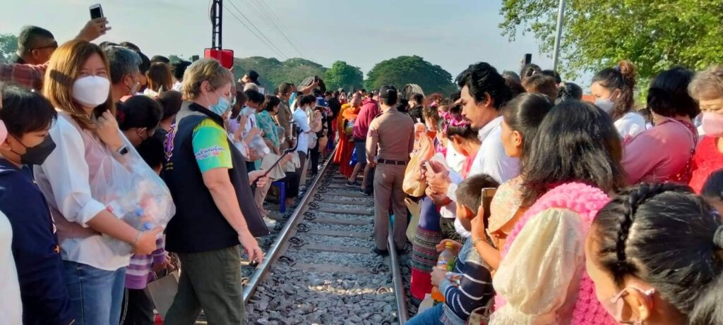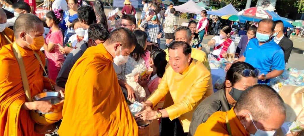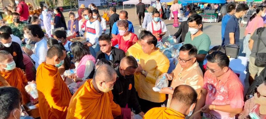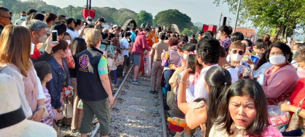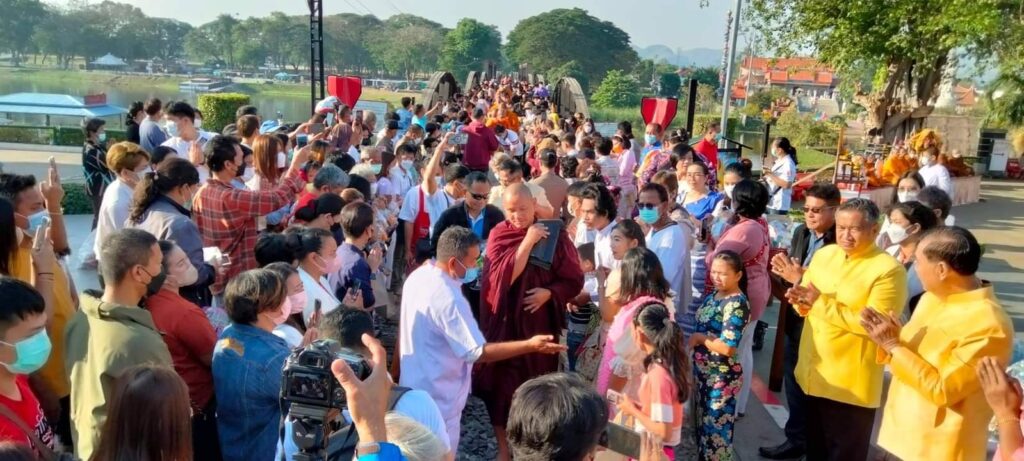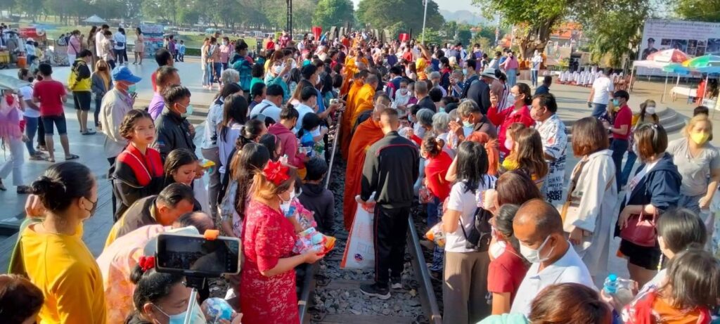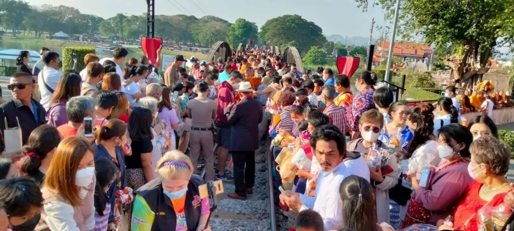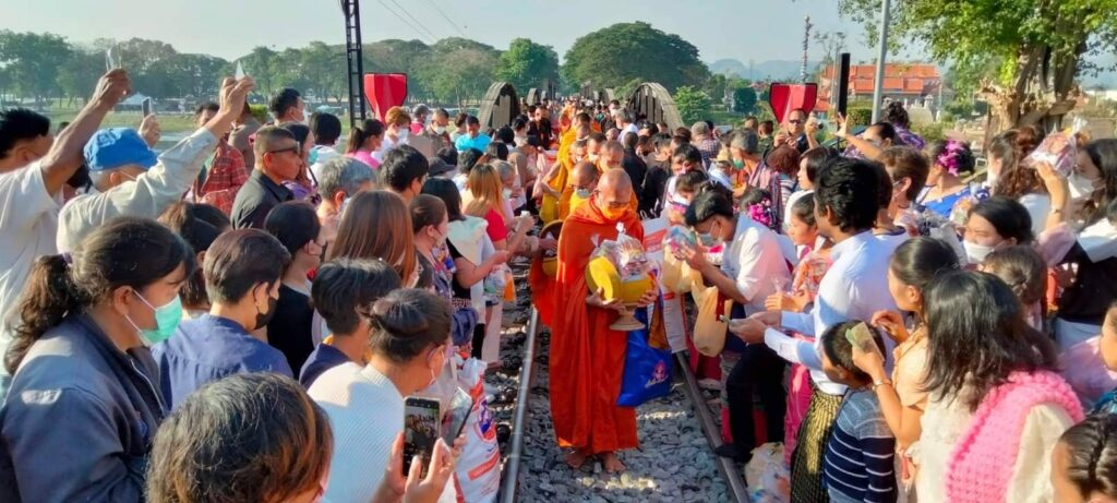 ในการนี้ได้มีพี่น้องประชาชนชาวจังหวัดกาญจนบุรี นักท่องเที่ยวทั้งชาวไทยและชาวต่างประเทศ มาร่วมงานทำบุญตักบาตรในเทศกาลขึ้นปีใหม่ 2566 นี้จำนวนมากเป็นประวัติการณ์.