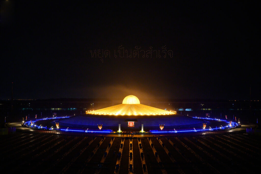 การใช้โดรนแปรอักษรสอนธรรมะทางอากาศ เป็นการปรับกิจกรรมให้เข้ากับยุคสมัย ในปีนี้มีการแปรอักษรเป็นภาพการสอนสมาธิ ประกอบคำบรรยาย และบทเพลงธรรมะ ตามที่พระเดชพระคุณพระมงคลเทพมุนี (สด จนฺทสโร) เมตตามอบเป็นมรดกธรรมว่า “หยุด เป็นตัวสำเร็จ” หมายถึง การนำใจมาหยุดอยู่ภายในกลางตัวของเรา ณ ศูนย์กลางกายฐานที่ 7 ส่วน “สัมมา อะระหัง” คือคำบริกรรมภาวนา ที่ต้องนึกควบคู่กับบริกรรมนิมิต เมื่อใจหยุดอย่างถูกส่วนที่ศูนย์กลางกายฐานที่ 7 ก็จะเข้าถึงดวงธรรมภายใน และพระธรรมกายภายใน โดยตลอดเส้นทางการทำสมาธิต้องปฏิบัติอย่างมีสติ และมีความสบายควบคู่กัน