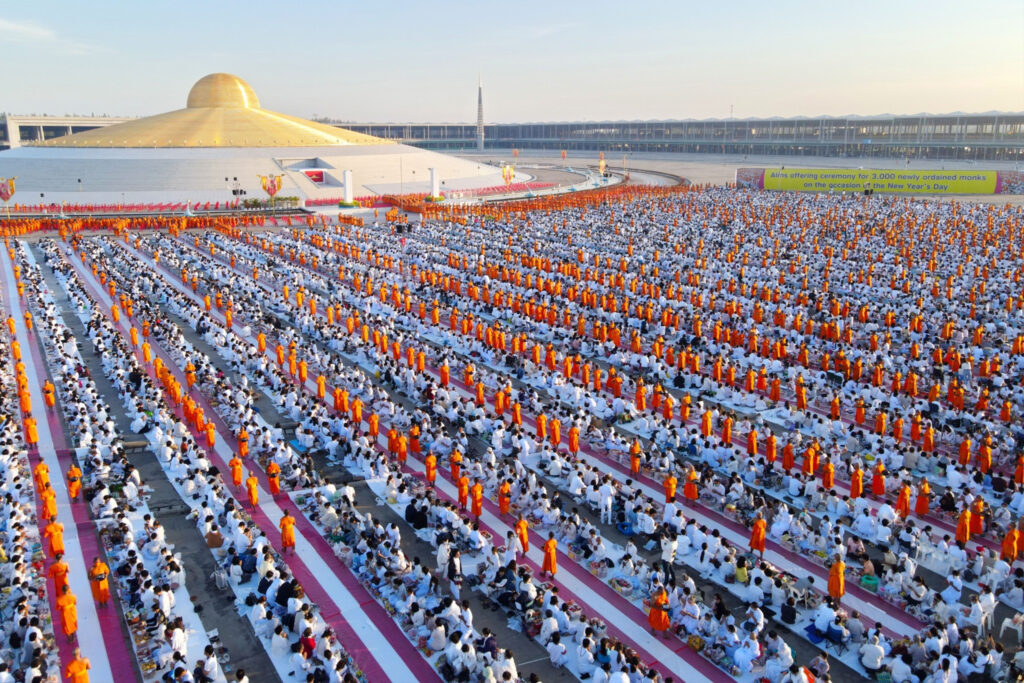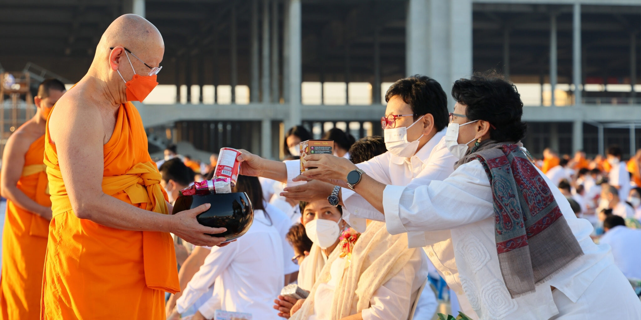 ในส่วนของพิธีตักบาตรพระ 3,000 รูป ต้อนรับศักราชใหม่ ในวันนี้นั้น ได้รับความเมตตาจากพระภาวนาธรรมวิเทศ ผู้ช่วยเจ้าอาวาสวัดพระธรรมกาย เป็นประธานสงฆ์ พร้อมด้วยคณะสงฆ์ในโครงการอุปสมบทบูชาธรรมมหาปูชนียาจารย์ร่วมรับบาตร โดยมีพุทธศาสนิกชนร่วมพิธีจำนวนมาก ภายใต้มาตรการป้องกันโควิด-19 อย่างเคร่งครัด.