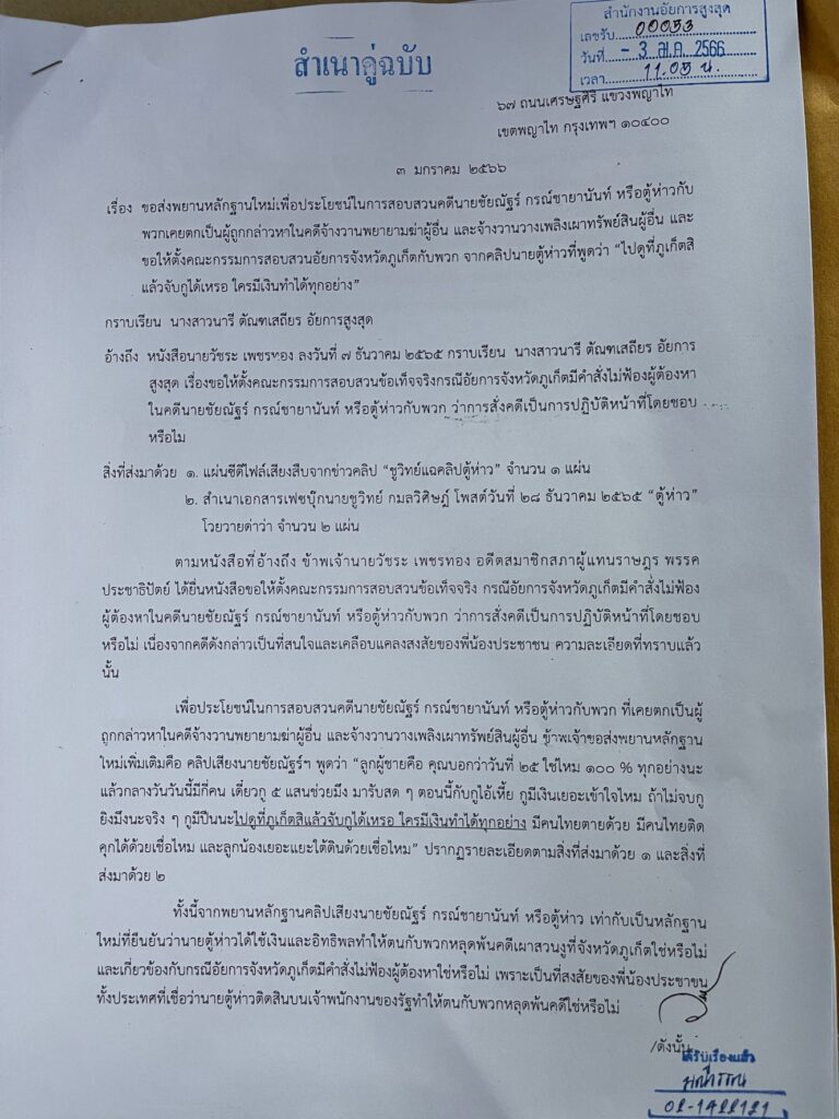 (3 ม.ค.66)เมื่อเวลา 11.05 น.ที่สำนักงานอัยการสูงสุด นายวัชระ เพชรทอง อดีตส.ส.พรรคประชาธิปัตย์ ยื่นหนังสือพร้อมพยานหลักฐานใหม่ผ่านนายโกศลวัฒน์ อินทุจันทร์ยง รองโฆษกสำนักงานอัยการสูงสุดถึงน.ส.นารี ตัณฑเสถียร อัยการสูงสุด เพื่อประโยชน์ในการสอบสวนคดีนายชัยณัฐร์ กรณ์ชายานันท์ หรือตู้ห่าวกับพวกที่เคยตกเป็นผู้ถูกกล่าวหาในคดีจ้างวานพยายามฆ่าผู้อื่น และจ้างวานวางเพลิงเผาทรัพย์สินผู้อื่น โดยขอให้ตั้งคณะกรรมการสอบสวนอัยการจังหวัดภูเก็ตกับพวก จากคลิปนายตู้ห่าวที่พูดว่า “ไปดูที่ภูเก็ตสิแล้วจับกูได้เหรอ ใครมีเงินทำได้ทุกอย่าง” ซึ่งก่อนหน้านี้ นายวัชระ ได้ยื่นหนังสือขอให้ตั้งคณะกรรมการสอบสวนข้อเท็จจริง กรณีอัยการจังหวัดภูเก็ตมีคำสั่งไม่ฟ้องผู้ต้องหาในคดีนายตู้ห่าวกับพวกว่า การสั่งคดีเป็นการปฏิบัติหน้าที่โดยชอบหรือไม่ เนื่องจากคดีนี้เป็นที่สนใจและเคลือบแคลงสงสัยของประชาชน ดังนั้น เพื่อประโยชน์ในการสอบสวนคดีที่นายตู้ห่าวกับพวก เคยตกเป็นผู้ถูกกล่าวหาในคดีดังกล่าว จึงขอส่งพยานหลักฐานใหม่เพิ่มเติมคือ คลิปเสียงนายชัยณัฐร์ฯ พูดว่า “ลูกผู้ชายคือ คุณบอกว่าวันที่ 25 ใช่ไหม 100 % ทุกอย่างนะ แล้วกลางวันวันนี้มีกี่คน เดี๋ยวกู 5 แสนช่วยมึง มารับสด ๆ ตอนนี้กับกูไอ้เหี้ย กูมีเงินเยอะเข้าใจไหม ถ้าไม่จบกูยิงมึงนะจริง ๆ กูมีปืนนะไปดูที่ภูเก็ตสิแล้วจับกูได้เหรอ ใครมีเงินทำได้ทุกอย่าง มีคนไทยตายด้วย มีคนไทยติดคุกได้ด้วยเชื่อไหม และลูกน้องเยอะแยะใต้ดินด้วยเชื่อไหม” ซึ่งหลักฐานสำคัญชิ้นนี้ถือเป็นหลักฐานใหม่ที่ยืนยันว่านายตู้ห่าวได้ใช้เงินและอิทธิพลทำให้ตนกับพวกหลุดพ้นคดีเผาสวนงูที่จังหวัดภูเก็ตใช่หรือไม่ และเกี่ยวข้องกับกรณีอัยการจังหวัดภูเก็ตมีคำสั่งไม่ฟ้องผู้ต้องหาใช่หรือไม่ ซึ่งประชาชนทั้งประเทศเชื่อว่านายตู้ห่าวติดสินบนเจ้าพนักงานของรัฐทำให้ตนกับพวกหลุดพ้นคดีใช่หรือไม่