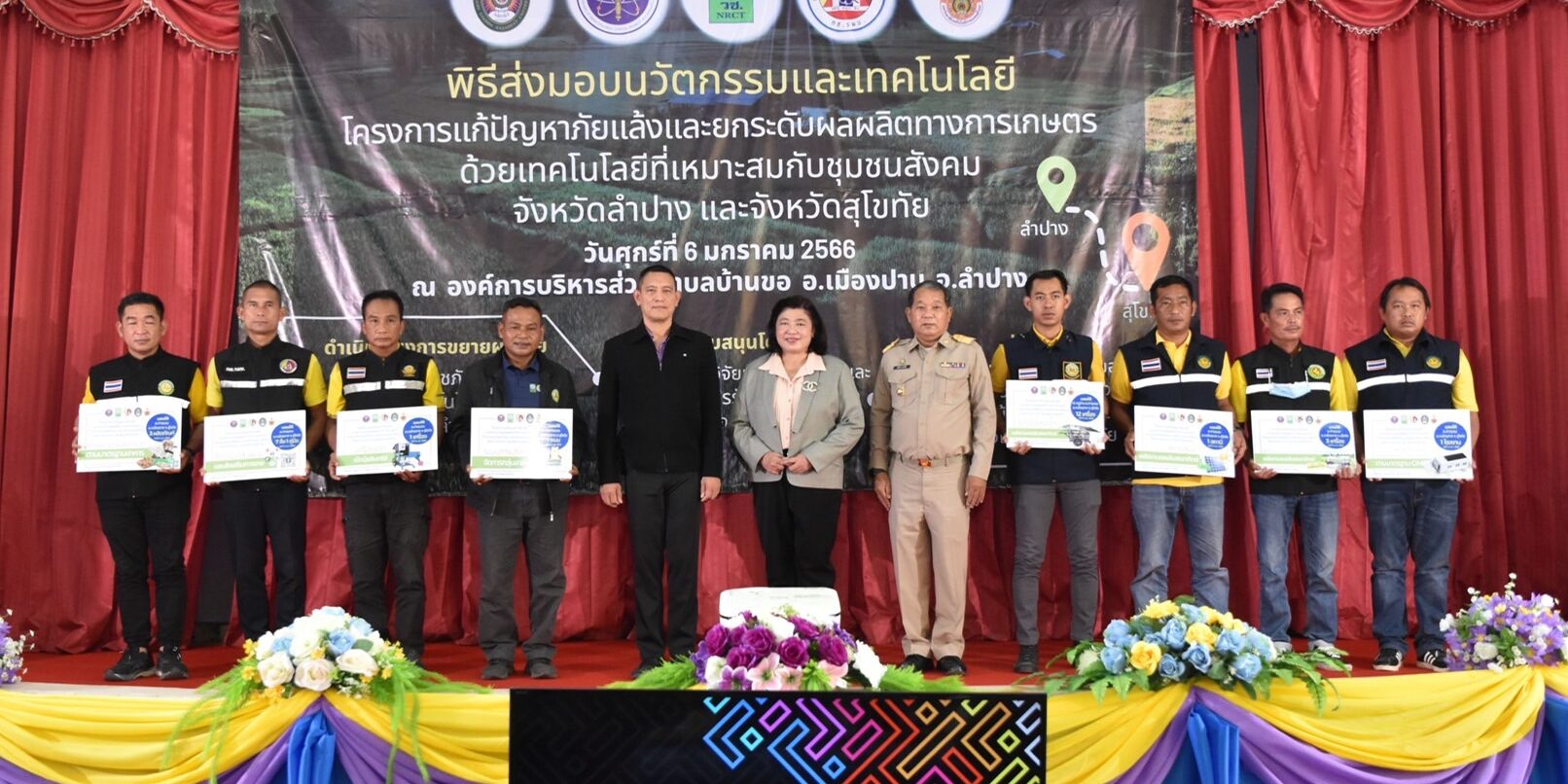 วันที่ 6 มกราคม 2566 กองอำนวยการรักษาความมั่นคงภายในราชอาณาจักร (กอ.รมน.) ร่วมกับ สำนักงานการวิจัยแห่งชาติ (วช.) กระทรวงการอุดมศึกษา วิทยาศาสตร์ วิจัยและนวัตกรรม จัดพิธีส่งมอบนวัตกรรมและเยี่ยมชมการสาธิตผลิตภัณฑ์เทคโนโลยีของชุมชน จากการดำเนินโครงการ “การแก้ปัญหาภัยแล้งและยกระดับผลผลิตทางการเกษตรด้วยเทคโนโลยีที่เหมาะสมกับชุมชนสังคม จังหวัดลำปางและสุโขทัย” เพื่อนำองค์ความรู้จากการวิจัยและนวัตกรรมมาใช้ประโยชน์ทางการเกษตร โดยมี พล.ท.อนุชา สังฆสุวรรณ ผู้อำนวยการศูนย์ประสานการปฏิบัติที่ 1 กอ.รมน. และ ดร.วิภารัตน์ ดีอ่อง ผู้อำนวยการสำนักงานการวิจัยแห่งชาติ เป็นประธานในพิธีส่งมอบฯ ซึ่งมี นายชนาธิป เสมแย้ม รองผู้ว่าราชการจังหวัดลำปาง นายณัฏฐพงศ์ สุขวิสิฏฐ์ รองผู้ว่าราชการจังหวัดสุโขทัย ให้การต้อนรับ พร้อมด้วย ผู้ทรงคุณวุฒิ (วช.) และ (กอ.รมน.) ผู้นำองค์กรปกครองส่วนท้องถิ่น คณะนักวิจัย เกษตรกรในพื้นที่ และสื่อมวลชน เข้าร่วมงาน ณ องค์การบริหารส่วนตำบลบ้านขอ อำเภอเมืองปาน จังหวัดลำปาง
