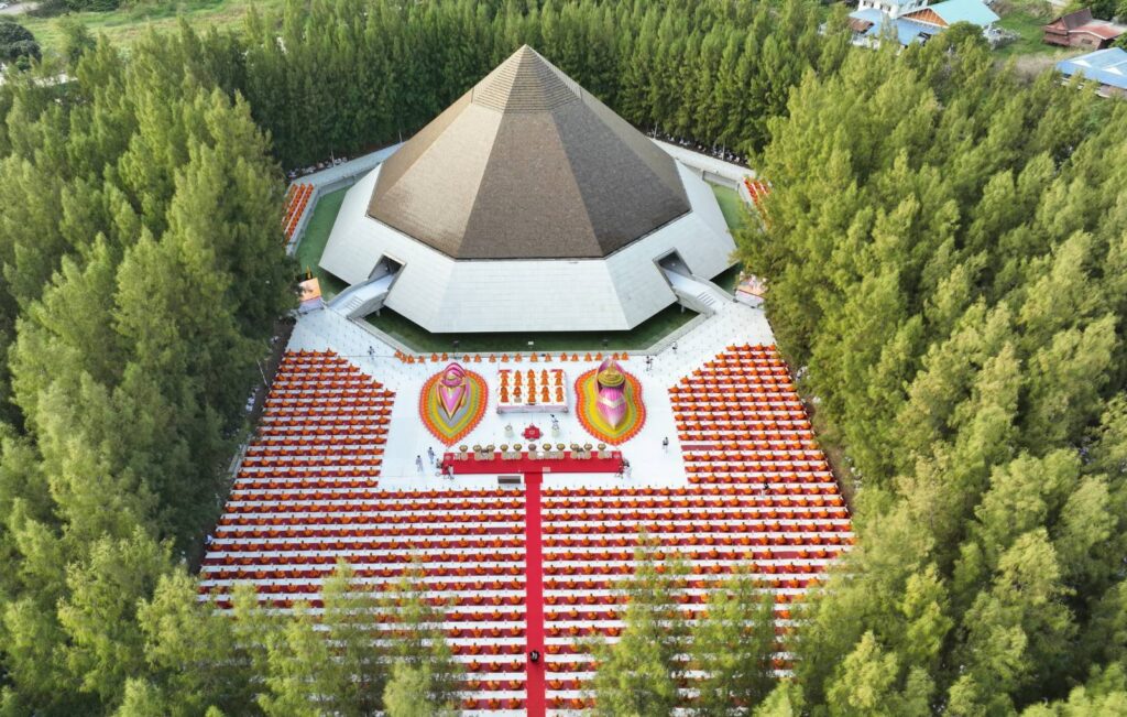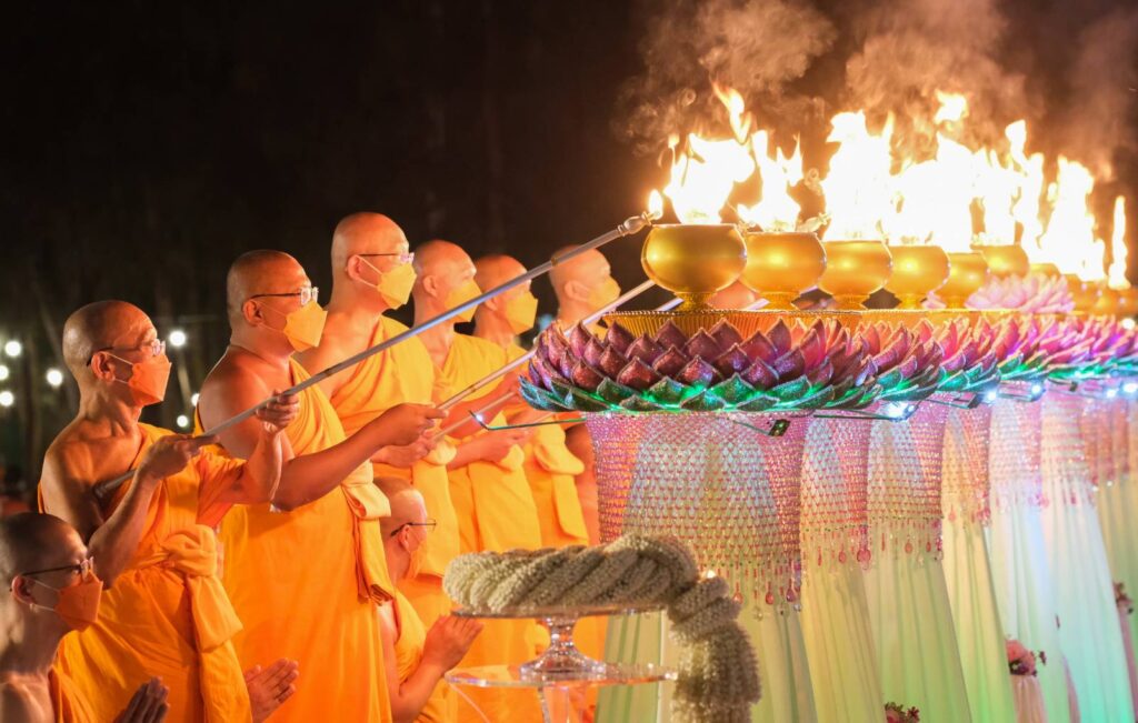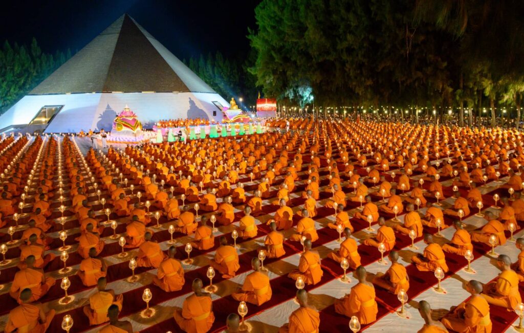จากนั้นในเวลา 17.50 น. พระครูสมุห์ธานินทร์ ปุญฺญนนฺโท ผู้ช่วยเจ้าอาวาสวัดพระธรรมกาย จ.ปทุมธานี นำกล่าวคำถวายประทีป และเป็นประธานจุดประทีปนับพันดวง ถวายเป็นพุทธบูชา และบูชาธรรมพระมงคลเทพมุนี (สด จนฺทสโร) พร้อมทั้งแสดงพระธรรมเทศนาเรื่อง ความสำคัญของสถานที่เกิดด้วยรูปกายเนื้อ พระมงคลเทพมุนี (สด จนฺทสโร) “อนุสรณ์สถานบ้านเกิดพระมงคลเทพมุนี (สด จนฺทสโร) สถานที่เกิดรูปกายเนื้อของพระมงคลเทพมุนี ตั้งอยู่บนแผ่นดินรูปดอกบัว มีน้ำล้อมรอบ อยู่ตรงข้ามวัดสองพี่น้อง (พระอารามหลวง) ที่ อำเภอสองพี่น้อง จังหวัดสุพรรณบุรี มีพื้นที่ประมาณ 20 ไร่ คณะศิษยานุศิษย์ได้ร่วมกันจัดสร้าง มหาวิหารพระมงคลเทพมุนี (สด จนฺทสโร) เป็นรูปทรงภูเขาทอง 8 เหลี่ยม ภายในบันทึกประวัติการสร้างบารมีของท่านตั้งแต่ปฐมวัย มัชฌิมวัย และปัจฉิมวัย บริเวณกลางมหาวิหารฯ ประดิษฐานรูปหล่อทองคำของพระเดชพระคุณพระมงคลเทพมุนี เพื่อให้สาธุชนได้กราบไหว้” พระครูสมุห์ธานินทร์ กล่าว