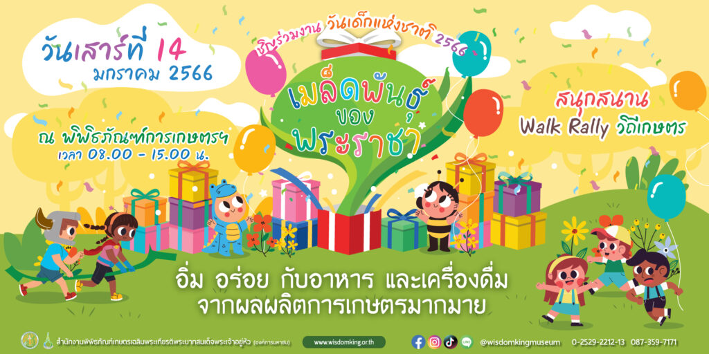 วันที่ 8 มกราคม 2566 พิพิธภัณฑ์การเกษตรเฉลิมพระเกียรติพระบาทสมเด็จพระเจ้าอยู่หัว จังหวัดปทุมธานี เชิญชวนคุณพ่อ คุณแม่ ผู้ปกครองทุกท่านจูงมือลูก จับมือหลาน เที่ยวงานวันเด็กแห่งชาติ “เมล็ดพันธุ์ของพระราชา” ในวันเสาร์ที่ 14 มกราคม 2566 ตั้งแต่เวลา 08.00 – 15.00 น. ณ พิพิธภัณฑ์การเกษตรเฉลิมพระเกียรติฯ ตรงข้ามโรงพยาบาลการุญเวช (นวนคร) ริมถนนพหลโยธิน จ.ปทุมธานี