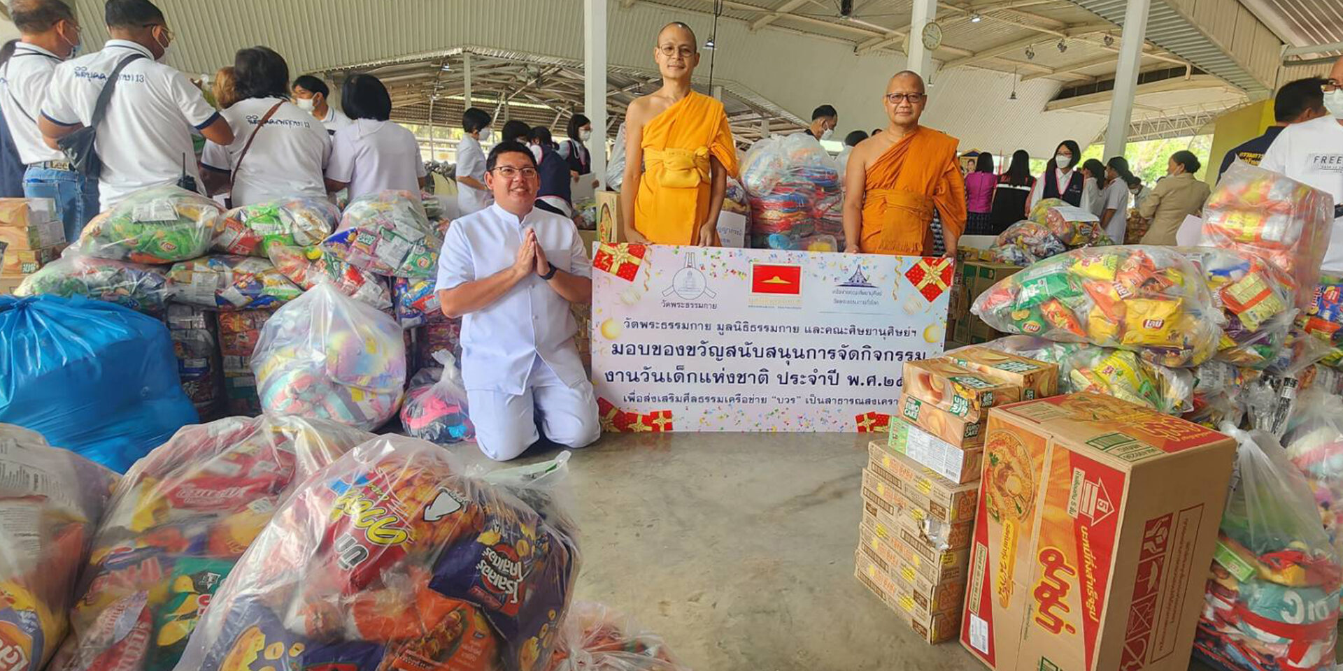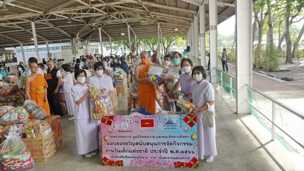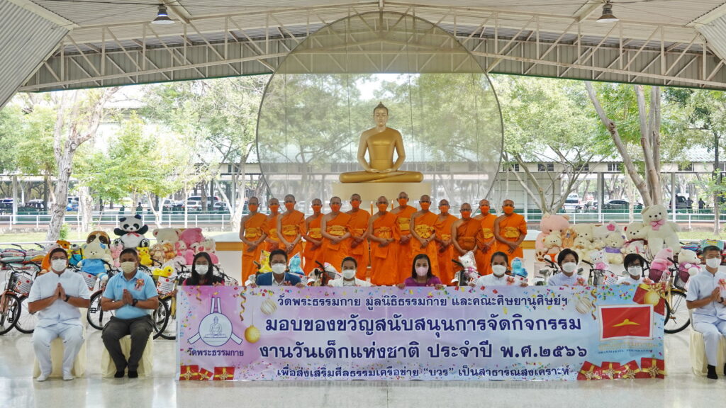 เมื่อเวลา 10.00 น. วันที่ 10 มกราคม 2566 ที่อาคารโถงช้างฯ วัดพระธรรมกาย อ.คลองหลวง จ.ปทุมธานี พระครูสังฆรักษ์ รังสฤษดิ์ อิทฺธิจินฺตโก เจ้าอาวาสวัดพระธรรมกาย ประธานสงฆ์ พร้อมด้วย พระวิเทศธรรมาภรณ์ ประธานมูลนิธิธรรมกาย เป็นประธานในการส่งมอบของขวัญเพื่อสนับสนุนการจัดกิจกรรมเนื่องในงานวันเด็กแห่งชาติ ประจำปี พ.ศ. 2566 ให้กับองค์กรภาคีเครือข่าย “บวร” ในเขตพื้นที่วงรอบของวัดพระธรรมกาย และจังหวัดปทุมธานี เป็นสาธารณสงเคราะห์ เพื่อน้อมถวายเป็นพระกุศล แด่สมเด็จพระเจ้าลูกเธอ เจ้าฟ้าพัชรกิติยาภา นเรนทิราเทพยวดี กรมหลวงราชสาริณีสิริพัชร มหาวัชรราชธิดา โดยมีผู้บริหารองค์กรภาคีเครือข่ายบวร ผู้นำชุมชนหมู่บ้าน ผู้บริหารสถานศึกษา ผู้แทนองค์กรภาคประชาสังคม จากกว่า 200 องค์กร เข้าร่วมงานฯ