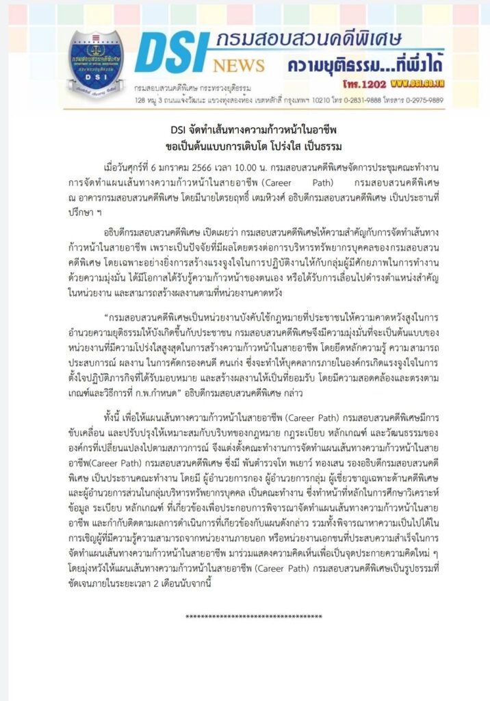 ทั้งนี้ เพื่อให้แผนเส้นทางความก้าวหน้าในสายอาชีพ (Career Path) กรมสอบสวนคดีพิเศษมีการขับเคลื่อน และปรับปรุงให้เหมาะสมกับบริบทของกฎหมาย กฎระเบียบ หลักเกณฑ์ และวัฒนธรรมขององค์กรที่เปลี่ยนแปลงไปตามสภาวการณ์ จึงแต่งตั้งคณะทำงานการจัดทำแผนเส้นทางความก้าวหน้าในสายอาชีพ (Career Path) กรมสอบสวนคดีพิเศษ ซึ่งมี พันตำรวจโท พเยาว์ ทองเสน รองอธิบดีกรมสอบสวนคดีพิเศษ เป็นประธานคณะทำงาน โดยมี ผู้อำนวยการกอง ผู้อำนวยการกลุ่ม ผู้เชี่ยวชาญเฉพาะด้านคดีพิเศษ และผู้อำนวยการส่วนในกลุ่มบริหารทรัพยากรบุคคล เป็นคณะทำงาน ซึ่งทำหน้าที่หลักในการศึกษาวิเคราะห์ข้อมูล ระเบียบ หลักเกณฑ์ ที่เกี่ยวข้องเพื่อประกอบการพิจารณาจัดทำแผนเส้นทางความก้าวหน้าในสายอาชีพ และกำกับติดตามผลการดำเนินการที่เกียวข้องกับแผนดังกล่าว รวมทั้งพิจารณาหาความเป็นไปได้ในการเชิญผู้ที่มีความรู้ความสามารถจากหน่วยงานภายนอก หรือหน่วยงานเอกชนที่ประสบความสำเร็จในการจัดทำแผนเส้นทางความก้าวหน้าในสายอาชีพ มาร่วมแสดงความคิดเห็นเพื่อเป็นจุดประกายความคิดใหม่ๆ โดยมุ่งหวังให้แผนเส้นทางความก้าวหน้าในสายอาชีพ (Career Path) กรมสอบสวนคดีพิเศษเป็นรูปธรรมที่ชัดเจนภายในระยะเวลา 2 เดือนนับจากนี้