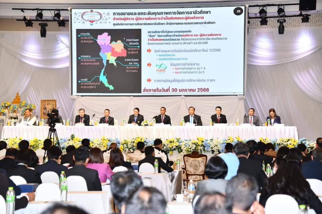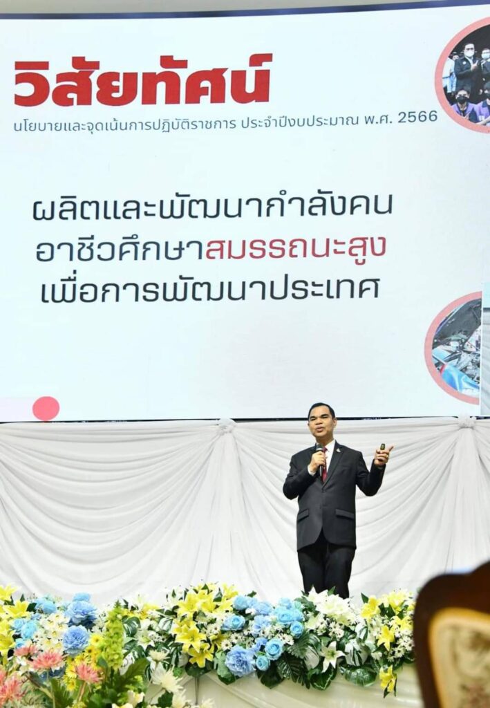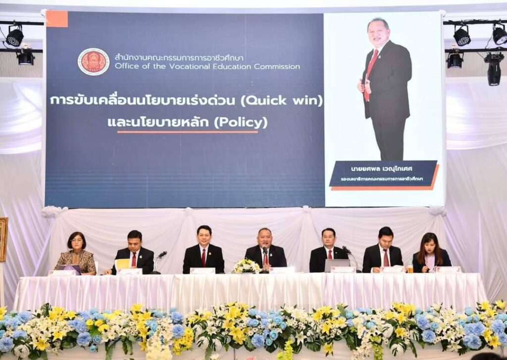ว่าที่ร้อยตรี ธนุ วงษ์จินดา เลขาธิการคณะกรรมการการอาชีวศึกษา เปิดเผยว่า สำนักงานคณะกรรมการการอาชีวศึกษา (สอศ.) จัดประชุมวิชาการ เพื่อการสื่อสารและถ่ายทอดวิสัยทัศน์ นำนโยบายไปสู่การปฏิบัติ ขับเคลื่อนตามนโยบายของรัฐบาล ยุทธศาสตร์ชาติ แผนแม่บทภายใต้ยุทธศาสตร์ชาติ แผนปฏิรูปประเทศ แผนพัฒนาเศรษฐกิจและสังคมแห่งชาติ และสอดคล้องนโยบายการจัดการศึกษาของรัฐมนตรีว่าการกระทรวงศึกษาธิการ (นางสาวตรีนุช เทียนทอง)ให้เกิดความเชื่อมั่นและสร้างความมั่นใจให้กับสังคม ประจำปีงบประมาณ พ.ศ. 2566 ของกระทรวงศึกษาธิการ โดย สอศ. ขับเคลื่อนนโยบายและจุดเน้น ภายใต้วิสัยทัศน์ “ผลิตและพัฒนากําลังคน อาชีวศึกษาสมรรถนะสูง เพื่อการพัฒนาประเทศ” และแนวคิด “ประเทศไทยมั่นคง รำ่รวย ด้วยมืออาชีวะ” ด้วย 9 นโยบายเร่งด่วน (Quick Win) และ 5 นโยบายหลัก (Policy) เพื่อยกระดับการจัดการอาชีวศึกษาในระดับภูมิภาค และเกิดการแลกเปลี่ยนเรียนรู้ และเข้าใจร่วมกัน โดยเฉพาะการเน้นย้ำกับทุกท่าน เกี่ยวกับแนวทางที่จะร่วมกันดําเนินงาน โดยผู้บริหารที่รับนโยบายไปสู่สถานศึกษาและคณะผู้บริหารสถานศึกษาในระดับพื้นที่ เพื่อขับเคลื่อนการดำเนินงานตามนโยบายเร่งด่วน (Quick Win) รวมถึงส่งเสริมการจัดการและการพัฒนาอาชีวศึกษาในระดับภูมิภาคอย่างเป็นรูปธรรม โดยมั่นใจว่าการสื่อสารในข้อมูลที่ถูกต้อง ความเข้าใจร่วมกัน เป็นปัจจัยความสําเร็จของงาน ภายใต้ OVEC One Team