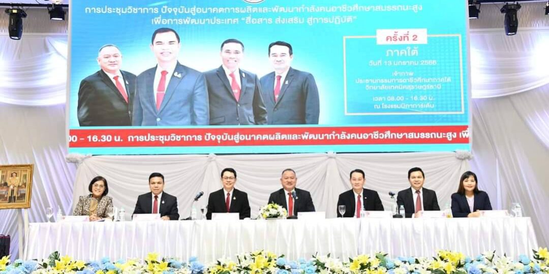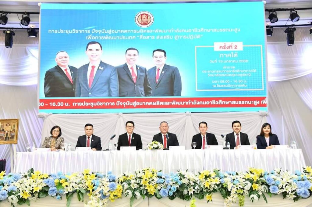 13 มกราคม 2566 ว่าที่ร้อยตรี ธนุ วงษ์จินดา เลขาธิการคณะกรรมการการอาชีวศึกษา เป็นประธานเปิดการประชุมวิชาการ ปัจจุบันสู่อนาคตการผลิตและพัฒนากำลังคนอาชีวศึกษาสมรรถนะสูง เพื่อการพัฒนาประเทศ “สื่อสาร ส่งเสริม สู่การปฏิบัติ” ภาคใต้และภาคใต้ชายแดน โดยมีนายยศพล เวณุโกเศศ เรืออากาศโท สมพร ปานดำ รองเลขาธิการคณะกรรมการการอาชีวศึกษา นายสง่า แต่เชื้อสาย ผู้ช่วยเลขาธิการคณะกรรมการการอาชีวศึกษา ผู้อำนวยการสำนัก ผู้อำนวยการศูนย์ ร่วมบรรยายพิเศษ ประธานกรรมการอาชีวศึกษาภาคใต้ กล่าวรายงาน มีผู้บริหารสถานศึกษาภาครัฐ 81 แห่ง และภาคเอกชน 43 แห่ง เจ้าหน้าที่ และผู้เกี่ยวข้อง เข้าร่วมประชุม ณ โรงแรมนิภาการ์เด้น จังหวัดสุราษฏร์ธานี