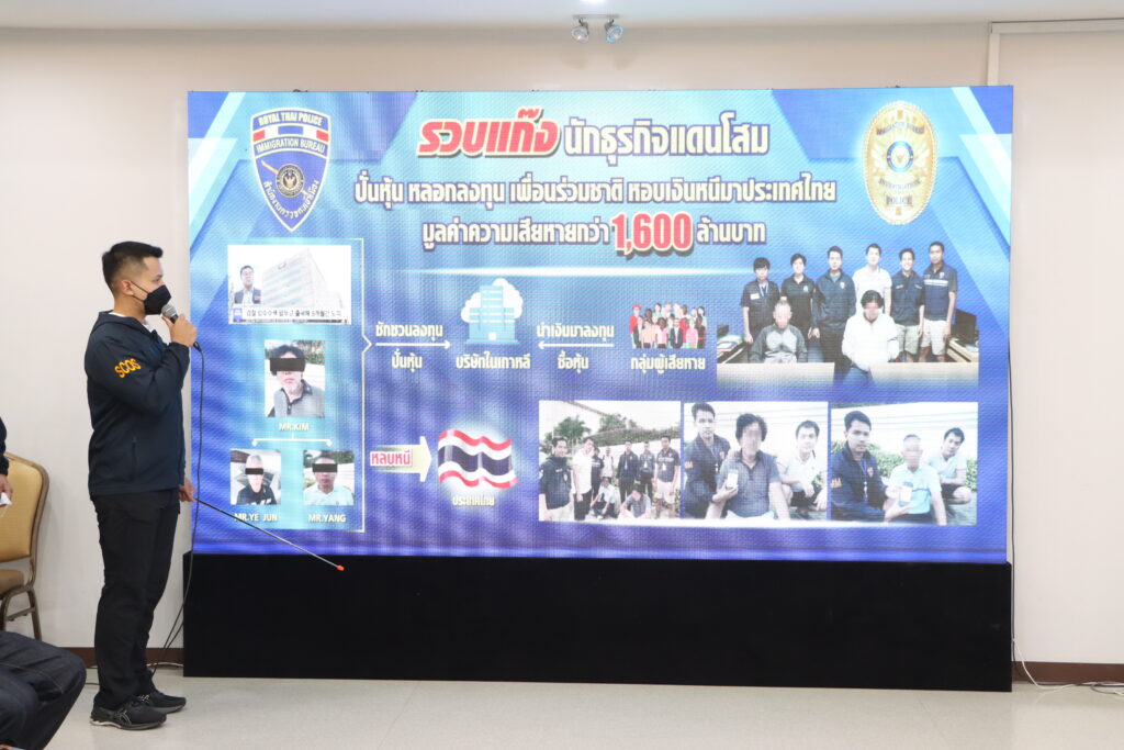 พฤติการณ์ เจ้าหน้าที่ตำรวจชุดจับกุม ได้ร่วมกันสืบสวนติดตาม นาย คิม อายุ 54 ปี และ นาย หยาง อายุ 60 ปี ซึ่งเป็น 2 ผู้ต้องหา ที่ยังติดตามจับกุมไม่ได้ โดยได้ทำการตรวจสอบข้อมูลในระบบเทคโนโลยีสารสนเทศ สตม. พบว่า นาย คิม เดินทางเข้ามาในประเทศไทย เมื่อวันที่ 25 ก.ค.65 ได้รับการยกเว้นการตรวจลงตราประเภท ผผ.90 และสิ้นสุดการอนุญาตวันที่ 22 ต.ค.65 และ นาย หยาง เดินทางเข้ามาในประเทศไทย เมื่อวันที่ 3 ส.ค.65 ได้รับการยกเว้นการตรวจลงตราประเภท ผผ.90 และสิ้นสุดการอนุญาตวันที่ 31 ต.ค.65 ต่อมาเจ้าหน้าที่ชุดจับกุมได้สืบทราบว่า นาย คิม และ นายหยาง ได้หลบหนีไปอยู่ด้วยกันที่ คอนโดหรูย่านสุขุมวิท จึงได้ไปตรวจสอบพบว่าทั้ง 2 คน ได้ย้ายที่พักหลบหนีหลังจากที่ นาย เย จุน หนึ่งในสมาชิกถูกจับกุม เจ้าหน้าที่ตำรวจจึงได้สืบสวนติดตามจนกระทั่ง ได้พบบุคคลสัญชาติเกาหลีตำหนิรูปพรรณคล้าย นาย คิม และ นายหยาง ที่บริเวณสนามกอล์ฟแห่งหนึ่งย่านจังหวัดปทุมธานี จึงแสดงตนเป็นเจ้าหน้าที่ตำรวจ ขอทำการตรวจสอบหนังสือเดินทางพบว่า ไม่ปรากฎข้อมูลการขออยู่ต่อ จึงได้เชิญตัวมายัง กก.3 บก.สส.สตม. เพื่อตรวจสอบข้อมูลในเทคโนโลยีสารสนเทศ ตม. ผลการตรวจสอบไม่พบข้อมูลการขออยู่ต่อ จึงแจ้งข้อหาและจับกุมดำเนินคดีดังกล่าว จากการตรวจสอบเพิ่มเติมพบว่า กลุ่มผู้ต้องหามีพฤติการณ์เป็นนักธุรกิจอุตสาหกรรมสิ่งทอ ที่ประเทศเกาหลีใต้ มีการเข้าซื้อบริษัทใหญ่และเป็นเจ้าของถึง 5 บริษัท มีการเปิดขายหุ้นบริษัท สร้างความน่าเชื่อถือ โดยนำเสนอข้อมูลบริษัทและผลประกอบการเท็จ เป็นเหตุให้ประชาชนหลงเชื่อ เข้ามาลงทุน อันเป็นลักษณะการปั่นหุ้น จากนั้นจึงได้หลบมาหนีมายังประเทศไทย