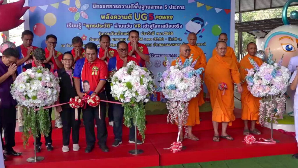 วันที่ 14 มกราคม 2566 ที่โรงเรียนอนุบาลองค์การบริหารส่วนตำบลคลองสาม อำเภอคลองหลวง จังหวัดปทุมธานี ผู้ปกครองพาบุตรหลานเที่ยวงานวันเด็กเรียนรู้นิทรรศการประกอบการแสดงความดีพื้นฐานสากล 5 ประการ “พลังความดี UG-5 POWER” 5 ความดีสากล ประกอบด้วย สะอาด, ระเบียบ, สุภาพ, ตรงเวลา และสมาธิ และศูนย์การเรียนรู้สื่อนวัตกรรมทางพระพุทธศาสนา “พุทธประวัติ” ผ่านแว่น VR สู่โลกเสมือนจริง