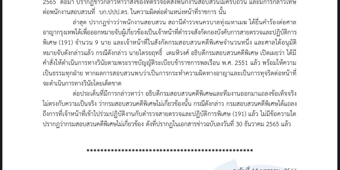 ต่อประเด็นที่มีการกล่าวหาว่า อธิบดีกรมสอบสวนคดีพิเศษและทีมงานออกมาแถลงข้อเท็จจริง ไม่ตรงกับความเป็นจริง ว่ากรมสอบสวนคดีพิเศษไม่เกี่ยวข้องนั้น กรณีดังกล่าว กรมสอบสวนคดีพิเศษได้แถลงถึงการที่เจ้าหน้าที่เข้าไปร่วมปฏิบัติงานกับตำรวจสายตรวจและปฏิบัติการพิเศษ (191) แล้ว ไม่มีข้อความใดปรากฏว่ากรมสอบสวนคดีพิเศษไม่เกี่ยวข้อง ดังที่ปรากฏในเอกสารข่าวฉบับลงวันที่ 30 ธันวาคม 2565 แล้ว