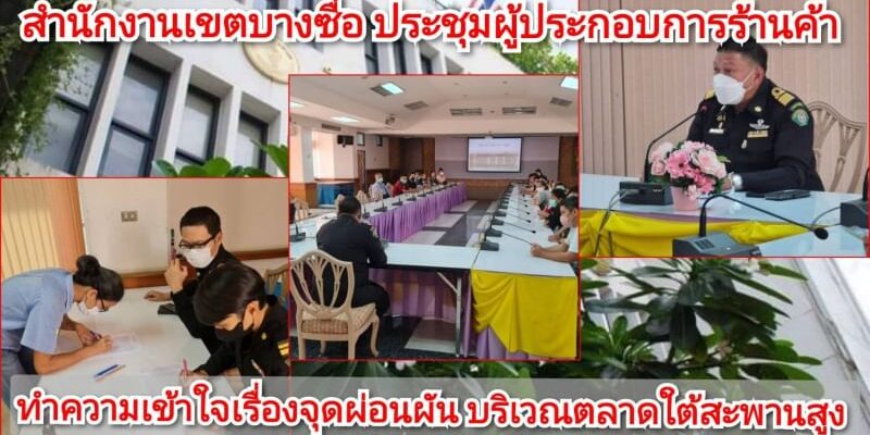 เมื่อวันศุกร์ที่ 13 มกราคม 2566 ผ่านมา เวลา 13:30 นายสรสิช เหลืองรุ่งเกียรติ ผู้อำนวยการเขตบางซื่อ มอบหมายให้ นายคณิต ชุมช่วย หัวหน้าฝ่ายเทศกิจและเจ้าหน้าที่ชุดสายตรวจ251 ( บางซื่อ5 ) ประชุมผู้ประกอบการร้านค้า ทำความเข้าใจเรื่องการจัดระเบียบผู้ค้าในจุดผ่อนผัน ตลาดใต้สะพานสูง เขตบางซื่อ ณ.ห้องประชุมใหญ่ชั้น 7 สำนักงานเขตบางซื่อ เขตบางซื่อ กทม.